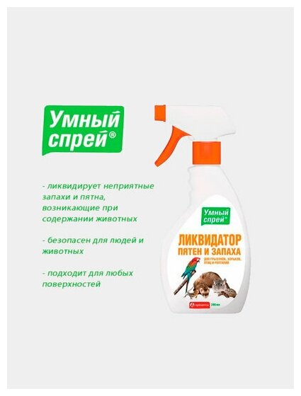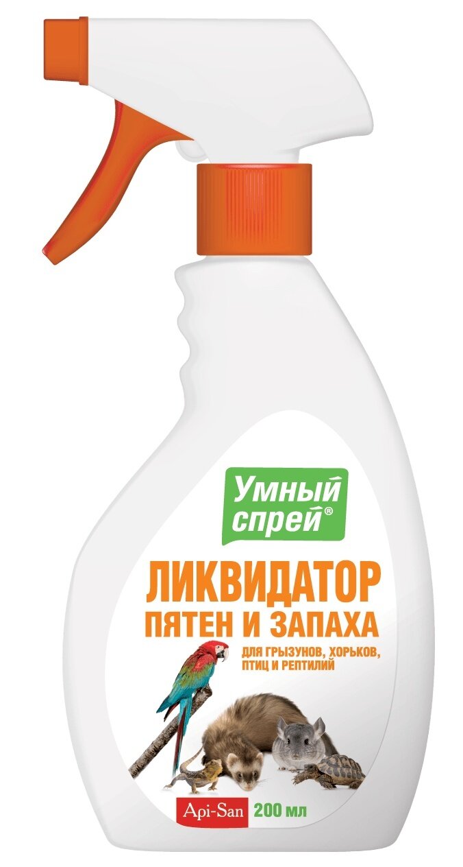 Спрей-ликвидатор пятен, меток и запаха для грызунов, хорьков и птиц — средство для нейтрализации неприятных запахов и дезинфекции туалетов кошек и собак декоративных пород. Помогает устранить причину неприятного запаха, предотвратить появление отложений на дне туалета. Средство продлевает срок службы наполнителя в несколько раз!Кроме того средство может применяться для уборки любых поверхностей: паркет, кафельная плитка и др. Удаляет как поверхностные загрязнения, так и остаточные органические вещества из пор дерева, бетона, керамики, тканей.В отличие от аналогов в форме порошка, средство абсолютно универсально – может применяться как для специальных наполнителей, так и для газет, бумаги и песка.При использовании наполнителей для туалета тщательно оросить их поверхность и перемешать.Объем: 200 мл.Умный спрей Ликвидатор пятен, меток и запаха для грызунов, хорьков, птиц, рептилий: эффективно избавляет от неприятного запаха;ликвидирует пятна, возникшие при содержании животных;нейтрализует аллергены;не оставляет разводов; освежает воздух.Встряхнуть флакон, несколькими нажатиями на распылитель разбрызгать содержимое с расстояния 20 – 30 см. После нанесения не вытирать средство с обработанных поверхностей. Заметный эффект наступает через несколько часов. При сильном запахе повторить обработку несколько раз.