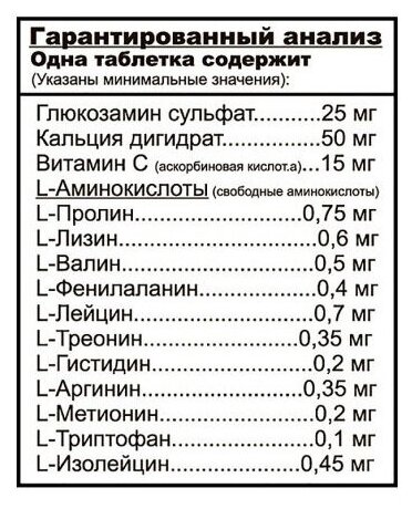 | Состав | глюкозамин сульфат, дигидрат кальция, аскорбиновая кислота, белково-сывороточный концентрат, изолят белково-сывороточный концентрата, ферментативные экстракты B. Subtilis (CH201/DSM5750), B.Licheniformis (CP200/DSM5749), МКЦ, ЗМЦ, стеарат кальция, ароматизатор |