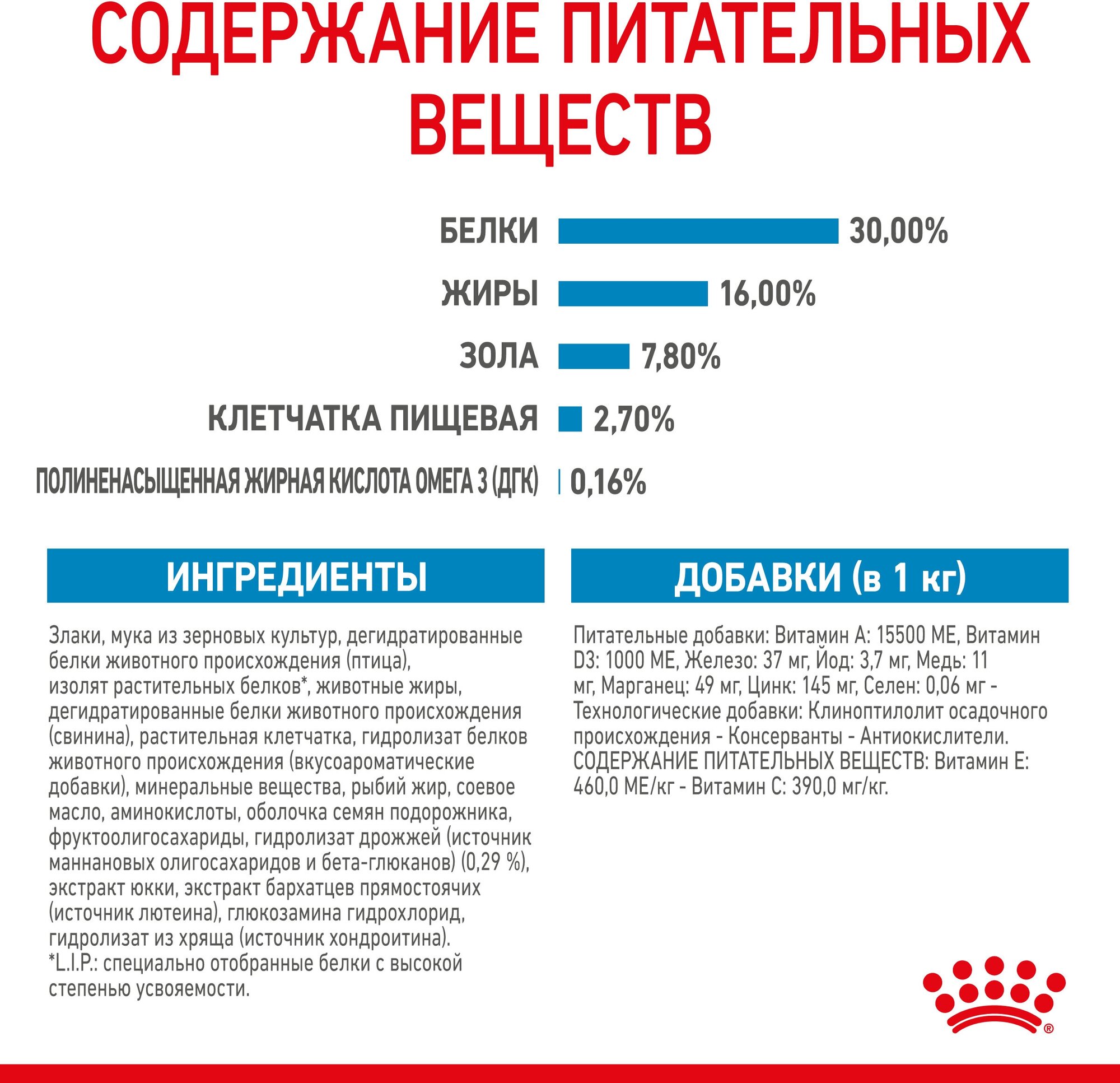- злаки, мука из зерновых культур, дегидратированные белки животного происхождения (птица), изолят растительных белков*, животные жиры, дегидратированные белки животного происхождения (свинина), растительная клетчатка, гидролизат белков животного происхождения (вкусоароматические добавки), минеральные вещества, рыбий жир, соевое масло, аминокислоты, оболочкa семян подорожника, фруктоолигосахариды, гидролизат дрожжей (источник мaннановых олигосахаридов и бета-глюканов) (0,29 %), экстракт юкки, экстракт бархатцев прямостоячих (источник лютеина), глюкозамина гидрохлорид, гидролизат из хряща (источник хондроитина).