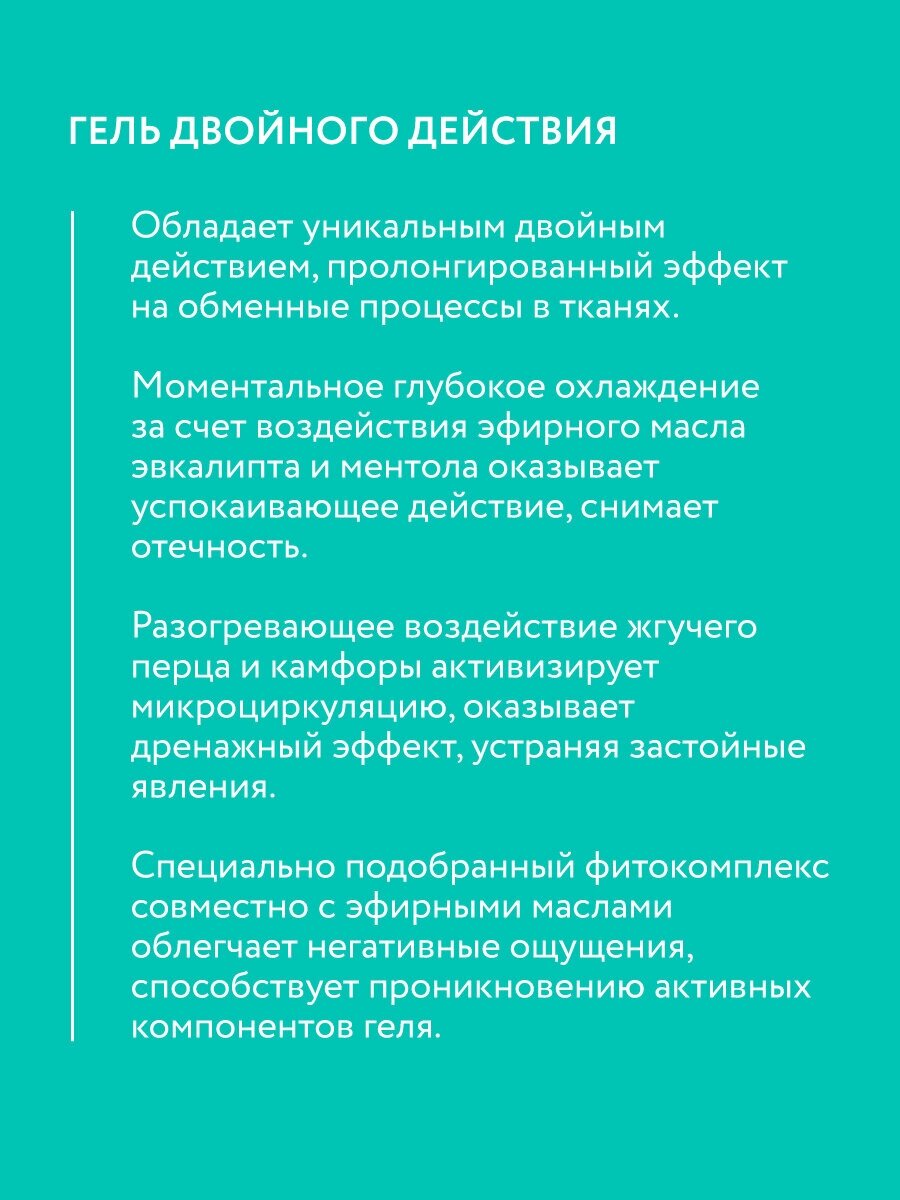 Разогревающий комплекс жгучего перца и камфоры активизирует микроциркуляцию, оказывает дренажный эффект, устраняя застойные явления.