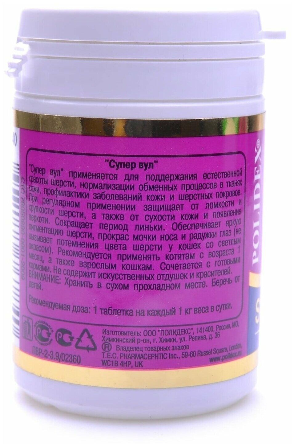 Витамины POLIDEX “SuperWool” (Полидэкс Супер Вул) предназначены для улучшения состояния шерсти, кожи, когтей и профилактики дерматитов. При регулярном применении защищают от ломкости и хрупкости шерсти, а также от сухости кожи и появления перхоти. Обеспечивают яркую пигментацию шерсти.Применение у кошек породы “канадский сфинкс” улучшается состояние кожи без усиления роста шерсти.Препарат поддерживает и нормализует следующие процессы в организме:• Формирует часть некоторых ферментных комплексов и необходим для нормализации роста и функций организма, играет ключевую роль в процессах обмена углеводов, жиров и белков (биотин). • Нормализация обменных процессов в базальном слое кожи, улучшение регенерации эпителия, теплообмена, восстановление метаболизма в волосяных луковицах, роста шерсти (В1, В5, В6, В12). • Улучшение белкового обмена, метаболизм белков, синтез белков шерсти, антиоксидантное, противовоспалительное действие (белок). Улучшение состояния сетчатки глаз, поддержка сердечной деятельности, поддержка репродуктивной функции, свёртываемость крови, процессы иммунитета, развитие и поддержание целостности нервной ткани, синтез желчных кислот, защитный эффект на клеточном уровне (таурин). • Способствует здоровому функционированию кишечной флоры (тгос).СоставПолидекс Супер шерсть в 1 таблетке содержит витамин B1 — 0,02 мг, витамин B5 — 0,6 мг, витамин B6 — 0,4 мг, витамин B12 — 1 мкг, витамин BC — 0,2 мг, витамин C — 3 мг, биотин — 0,6 мг, дериват с тгос — 3 мг, таурин — 10 мг, животный белок — 100 мг. Не содержит искусственных отдушек и красителей. Расфасовывают по 200 таблеток в пластиковые банки.Полидекс Супер шерсть применяется для поддержания естественной красоты шерсти, нормализации обменных процессов в тканях кожи, профилактики кожных болезней. Сокращает период линьки. Обеспечивает яркую пигментацию шерсти, прокрас мочки носа и радужки глаз. Не вызывает потемнения цвета шерсти у кошек со светлым окрасом. Рекомендуется применять котятам с 1-месячного возраста, а также взрослым кошкам.Дозы и способ примененияЗадают кошкам внутрь индивидуально из расчета 1 таблетка на 1 кг веса животного 1 – 3 раза в сутки непосредственно на корень языка или с небольшим количеством корма. Полидекс Супер шерсть сочетается с готовыми кормами.