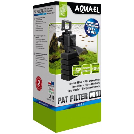 AQUAEL PAT MINI – миниатюрный турбинный фильтр PAT MINI предназначен для использования в небольших пресноводных аквариумах. Устройство состоит из небольшой головки и тщательно подобранной фильтрующей губки. Благодаря применению инновационных конструктивных решений максимальная пропускная способность головки достигает 400 л/ч, что сравнимо с типовой производительностью турбинного аквариумного фильтра средней величины. При всём этом потребление энергии не превышает 4 ватт. В результате фильтр PAT MINI обеспечит эффективную фильтрацию воды даже в 120-литровом аквариуме. При этом не следует опасаться, что в аквариумах меньшего размера работа фильтра вызовет “шторм”, так как на передней части головки фильтра установлен регулятор пропускной способности, позволяющий подобрать этот параметр в зависимости от потребностей. Кроме того, фильтр оснащен направленным наконечником, благодаря которому поток воды можно ограничить, например, направив его на стенку аквариумной ёмкости. Эффективное насыщение воды кислородом происходит благодаря подаче воздуха через трубку, присоединенную к выходному соплу.В комплект фильтра PAT MINI входит губка, улавливающая мельчайшие видимые загрязнения и обеспечивающая чрезвычайно эффективную механическую фильтрацию аквариумной воды. Кроме того, губка представляет собой идеальную среду для развития штаммов полезных нитрифицирующих бактерий, которые окисляют токсичные для рыб вещества: аммиак и нитраты. Уход за губкой очень прост и занимает не более минуты. Благодаря регулярному уходу мы обеспечим непрерывную работу фильтра, а обитатели нашего аквариума будут плавать в кристально чистой, не содержащей токсинов воде.Установка устройства не представит труда благодаря держателю с крепкими присосками и функциональному кронштейну для закрепления фильтра за край аквариумной стенки.Фильтр PAT MINI совместим со спринклером AQUAEL и стерилизатором воды AQUAEL MINI UV. К фильтру предлагаются сменные губчатые наполнители, как стандартные, так и в версии CARBOMAX (пропитанные активированным углём для удаления из воды химических загрязнений и устранения нежелательной окраски воды) и PHOSMAX (для удаления из воды фосфатов, что эффективно ограничивает рост водорослей).