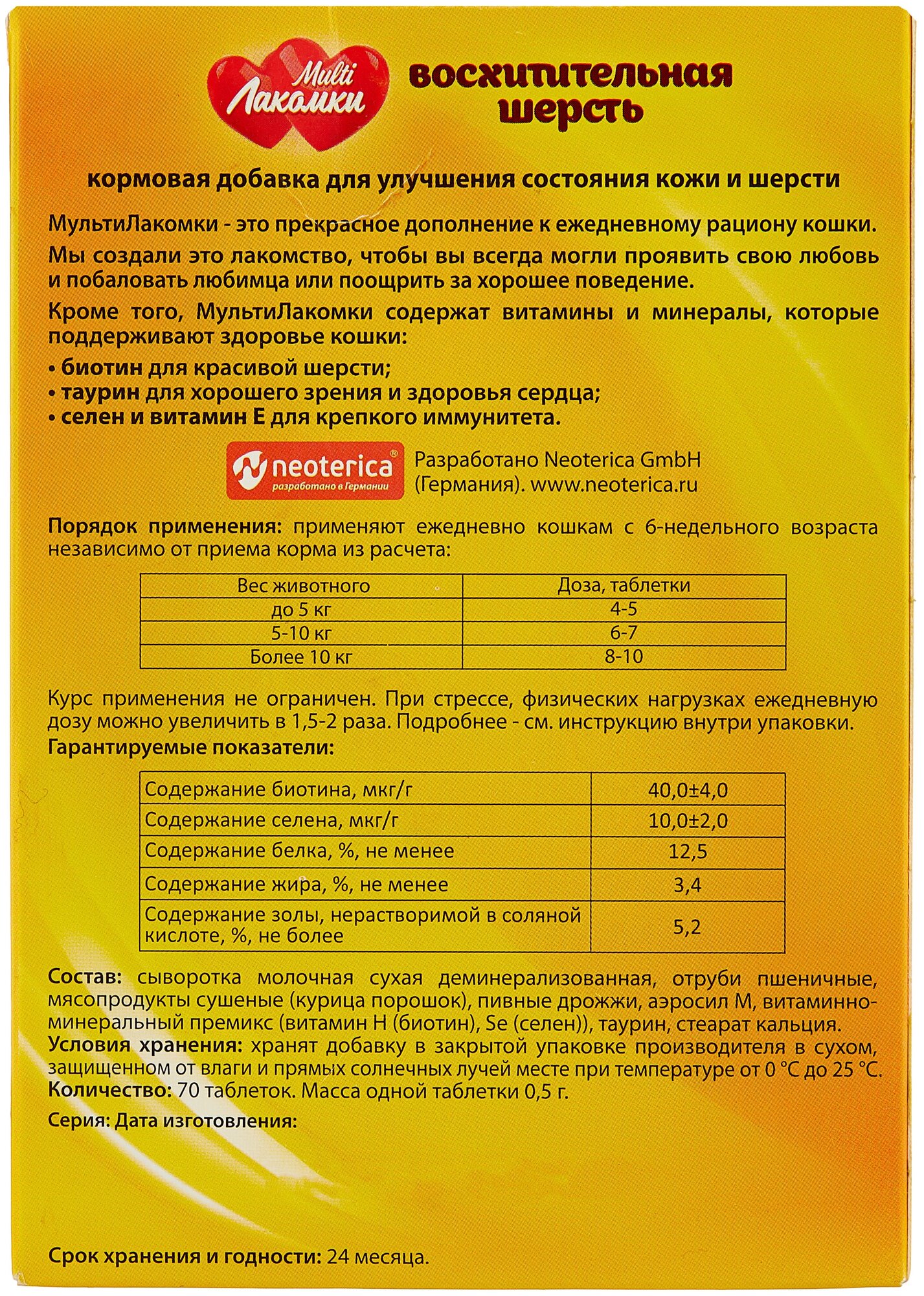 Кормовая добавка для кошек MultiЛакомки NEOTERICA Восхитительная шерсть таурин+селен 70таб