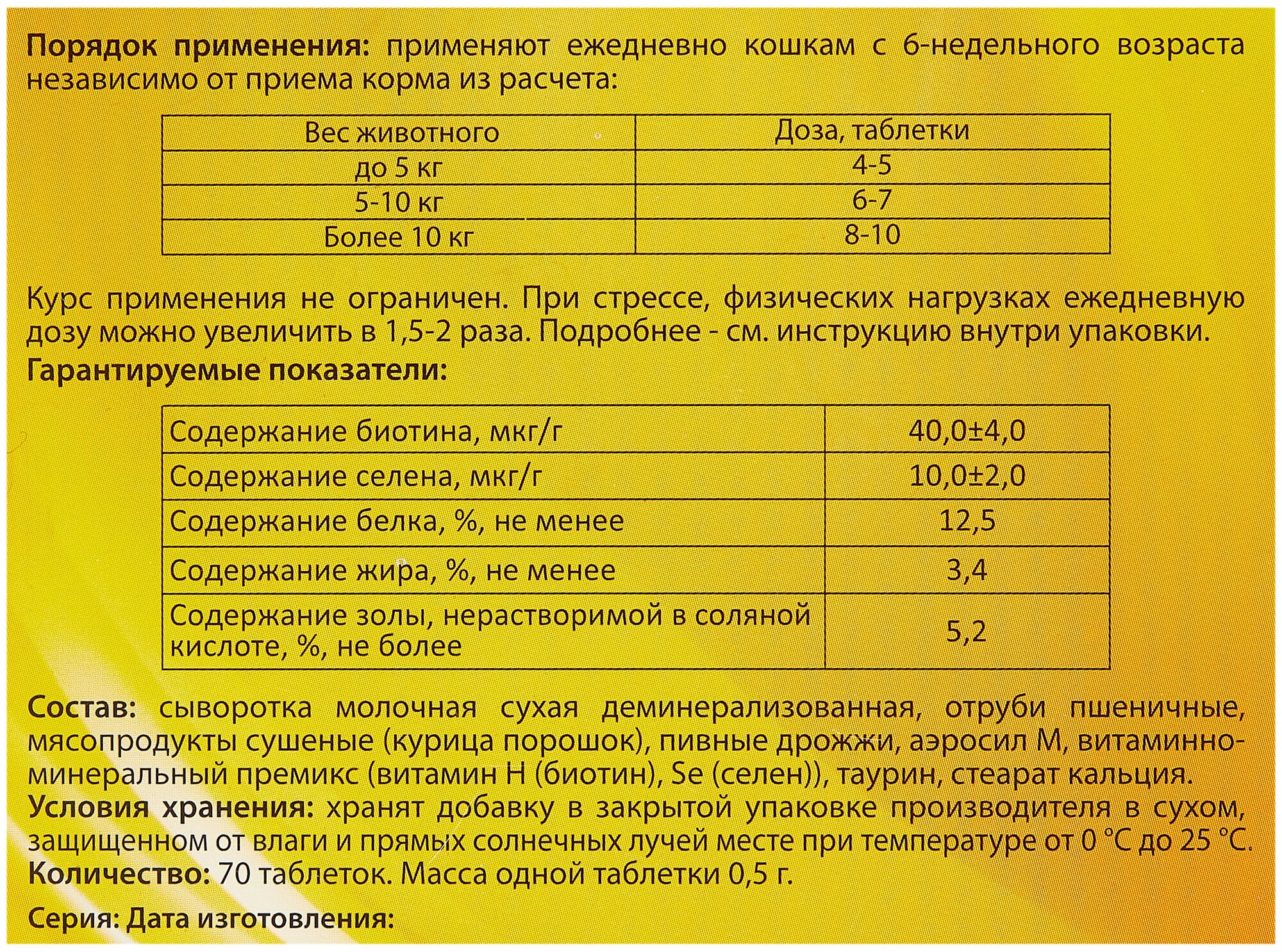 Состав: сыворотка молочная сухая деминерализованная, отруби пшеничные, мясопродукты сушёные (курица порошок), пивные дрожжи, аэросил М, витаминно-минеральный премикс (витамин Н (биотин), Se (селен), таурин, стеарат кальция.
