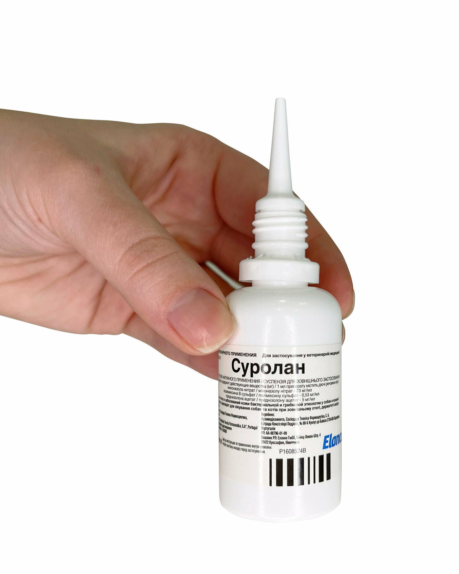 Суролан - суспензия для наружного применения для лечения отитов и заболеваний кожи бактериальной и грибковой этиологии у кошек и собак. Суролан – № 1 в России среди препаратов для лечения заболеваний уха по данным розничных продаж1Препарат обладает широким спектром антимикробной и антигрибковой активности, оказывает противовоспалительное и противоаллергическое действие.Суролан – препарат компании Elanco. Характеристики · Оказывает противовоспалительное и противоаллергическое действие· Оказывает фунгицидный и бактерицидный эффект· Способствует уменьшению зуда и заживлению поврежденных тканей· Можно беременным и кормящим животным, а также щенкам и котятам с 2-х недель*· Срок годности – 2 года · Произведено в Португалии Фармакологическое действие Суролан относится к группе антимикробных и антигрибковых лекарственных препаратов.По степени воздействия на организм Суролан относится к малоопасным веществам (4 класс по ГОСТ 12.1.007-76), в рекомендуемых дозах не оказывает местно-раздражающего, резорбтивно-токсического и сенсибилизирующего действия.