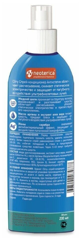 Спрей-антистатик Cliny — продукт профессионального качества. Он создан с учётом особенностей кожи и шерсти животных: ухаживает за кожей и шерстью и даёт превосходный результат. Эффект посещения груминг-салона у вас дома!