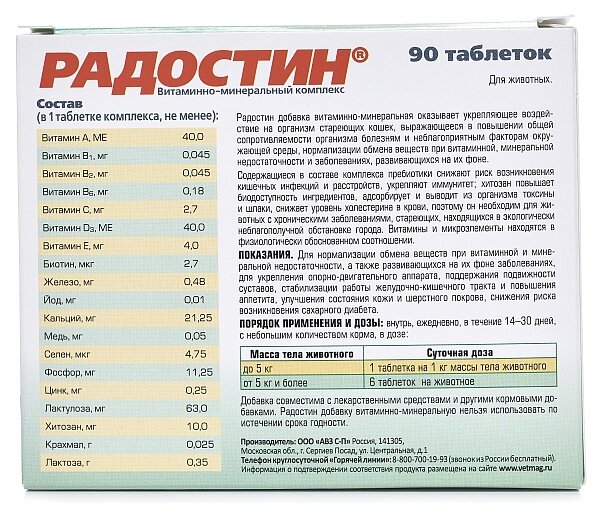 Витаминно-минеральный комплекс «Радостин» для кошек – это комбинированный препарат, в котором витамины, макро- и микроэлементы находятся в сбалансированном, физиологически обоснованном соотношении, обеспечивая таким образом его максимальную эффективность.