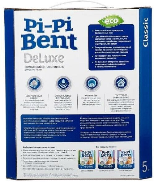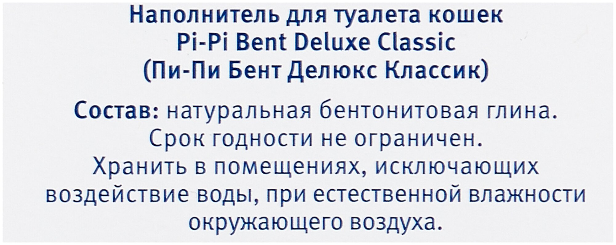 Классический комкующийся наполнитель супер-премиум класса Pi-Pi Bent Deluxe без отдушек, имеет небольшой размер гранул и понравится всем кошкам, предпочитающим мягкость и особый комфорт при посещении лотка. Подходит для животных с чувствительными лапками. Суперпрочный комок. Специально подобранный оптимальный размер гранул обеспечивает образование особо прочного комка стабильной структуры. Моментальное впитываниие. Уникальная структура природного бентонита гарантирует максимально быстрое поглощение влаги. Обыспылен. В технологическую схему производства включен этап очистки гранул от пыли. Отсутствие запаха в доме. Благодаря высоким абсорбирующим свойствам бентонита, наполнитель эффективно устраняет неприятные запахи в лотке и идеально поддерживает комфортную атмосферу Вашего дома. Прошел добровольную и экологическую сертификацию.
