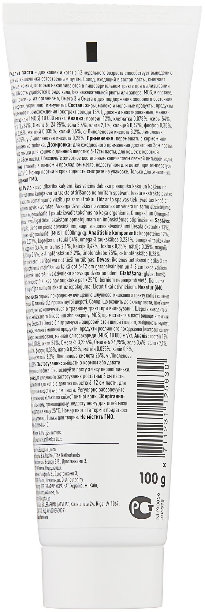 Мальт-паста – для кошек и котят с 12-недельного возраста способствует выведению шерсти из кишечника естественным путем. Солод, входящий в состав пасты, смягчает волосяные комки, которые накапливаются в пищеварительном тракте при вылизывании шерсти. Шерсть удаляется в виде кала, без нежелательной рвоты или запора. MOS, в составе, выводит токсины из организма, Омега-3 и Омега-6 для поддержания здорового состояния кожи, шерсти, укрепляет иммунитет.