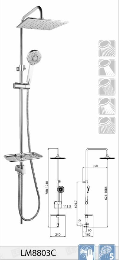 | Комплектация | мыльница, душевая штанга, верхний душ, душевая лейка, душевой шланг, смеситель, держатель для душевой лейки, инструкция |