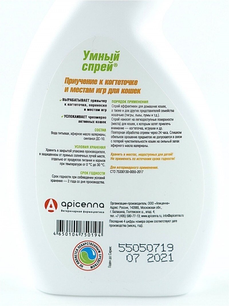 Состав: в 1 мл: эфирное масло мяты кошачьей - 6 мг, синтанол - 15 мг, спирт изопропиловый - 175 мг и вода очищенная до 1 мл. Свойства: входящий в состав зоогигиенического средства экстракт мяты кошачьей содержит химическое соединение, называемое актинидином. Именно оно и привлекает кошек.Действие препарата основано на способности актинидина воздействовать на нервную систему кошек. Флегматичные особи после контакта с зоогигиеническим средством становятся подвижными, игривыми и более контактными со своими владельцами.Зоогигиеническое средство эффективно для домашних кошек, а также и для других представителей семейства кошачьих (тигры, львы, пумы и т. д.).Применение: нанести зоогигиеническое средство на места, к которым Вы хотите привлечь внимание кошек - когтеточка, игрушки и др, это должны быть легкодоступные поверхности для животного. Повторять обработку зоогигиеническим средством с периодичностью 1 раз в день. Не орошать предметы слишком обильно, так как кошка может перестать реагировать на сильный запах мяты кошачьей.Хранение: хранят зоогигиеническое средство в защищенном от света месте, отдельно от пищевых продуктов и кормов, при температуре от 0°С до 25°С.