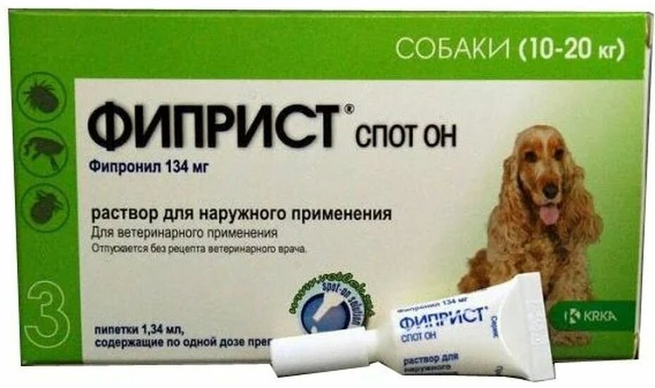 Сервис сравнения цен СкидкаГИД предлагает сравнить цены на товар «Капли для собак KRKA Фиприст Спот Он от блох и клещей, весом 10-20килограмм 134мг, 3 пипетки»