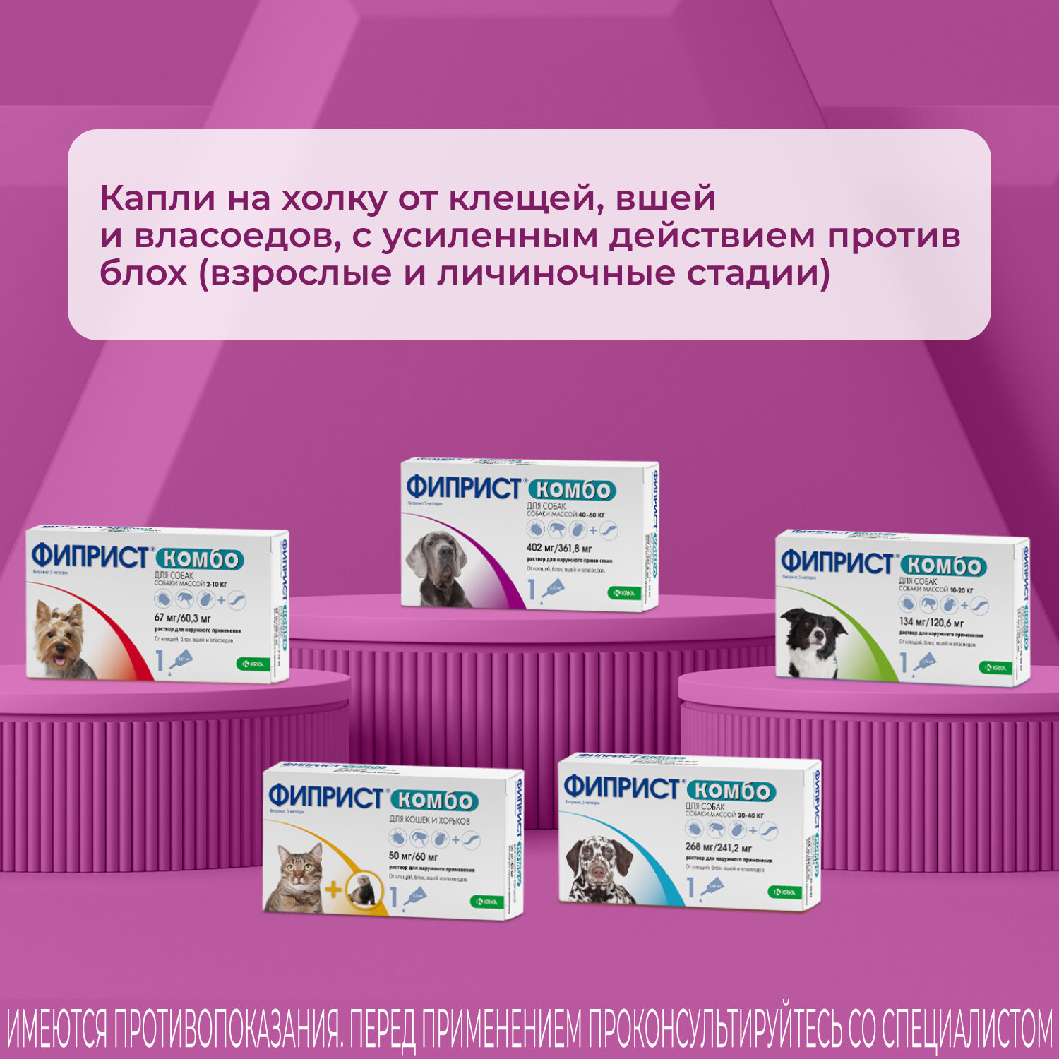 Фиприст Комбо - современное средство профилактики и уничтожения блох, клещей, власоедов и вшей у собак.Фиприст Комбо активен в отношении: блох (половозрелые и преимагинальные фазы развития) Ctenocephalides spp.; власоедов Felicola subrostratus, Trichodectes canis; иксодовых клещей (все фазы развития) Dermacentor variabilis, Rhipicephalus sanguineus, Ixodes scapularis, lxodes ricinus, Ixodes holocyclus, Haemaphysalis longicornis, Haemaphysalis flava, Haemaphysalis campanulata, Haemaphysalis leachi, Amblyomma americanum; комаров Aedes aegypti; саркоптоидных клещей Sarcoptes scabiei var. canis.После нанесения на кожу действующие вещества постепенно распределяются по всей поверхности тела животного в течение 24 часов, практически не всасываясь в системный кровоток, накапливаются в эпидермисе, волосяных луковицах и сальных железах, оказывают длительное контактное действие, обеспечивая защиту животного от эктопаразитов.Однократная обработка животного обеспечивает уничтожение блох и клещей в течение 24 и 48 часов, соответственно. Защитное действие препарата против иксодовых клещей продолжается у собак до 4 недель; против половозрелых и преимагинальных фаз развития насекомых у собак до 12 недель.Противопоказанием к применению является повышенная индивидуальная чувствительность животного к ингредиентам препарата (в том числе в анамнезе). Запрещается применение Фиприста(R) Комбо больным инфекционными болезнями и ослабленным животным, щенкам и котятам моложе 8-недельного возраста, собакам массой менее 2 кг, котятам массой менее 1 кг и хорькам в возрасте менее 6 мес.Порядок применения Фиприст Комбо применяют животным однократно путем топикального нанесения (спот-он) на сухую неповрежденную кожу, используя пипетки различной фасовки. Перед обработкой кончик пипетки прокалывают перевернутым колпачком, раздвигают у животного шерсть в области спины (между лопатками) и, нажимая на пипетку, наносят препарат на кожу в области холки в одну или несколько точек.Для обработки собак, масса которых более 60 кг, используют комбинацию пипеток разного объема.Обитающих совместно животных содержат раздельно до полного высыхания препарата. Не следует мыть животных моющими средствами, допускать их в природные водоемы в течение 48 часов после обработки, а также наносить препарат на влажную или поврежденную кожу.Препарат можно применять беременным и лактирующим собакам.