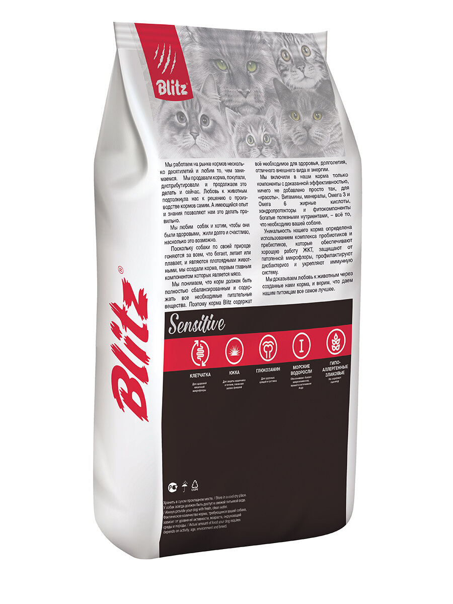 Сухой корм Blitz (Блиц) серии «Classic» с курицей для взрослых кошек всех пород..Особенности Blitz серии «Classic»:. Рацион содержит низкоаллергенные источники белка. Сбалансированный витаминно-минеральный комплекс обеспечивает организм животного всеми необходимыми компонентами. Ненасыщенные жирные кислоты Омега-3 и 6 обеспечивают иммунитет, здоровую кожу и отличную шерсть. Пробиотики, улучшают усвояемость корма и поддерживают иммунитет..Корм BLITZ CHIKEN ADULT CAT отличает сбалансированный состав и оптимальное содержание низкоаллергенных мясных белков, жиров, витаминов и микроэлементов, обеспечивающие все необходимые жизненные потребности взрослой кошки, а вкусовые качества удовлетворят даже самых привередливых животных... Особенности BLITZ CHIKEN ADULT CAT:. Мясо курицы содержит легкоусвояемый белок, необходимый для здорового роста и функционирования. Источником углеводов служат низкоаллергенные злаки (кукуруза, рис), а также овощи и фрукты. Клетчатка улучшает моторику и поддерживает здоровую микрофлору кишечника, способствует выводу шерсти из ЖКТ естественным путём. РН контроль обеспечивает здоровье мочеполовой системы. Экстракт Юкки Шидигера улучшает пищеварительный процесс, снижает метеоризм и уменьшает запах фекалий. Фукус (морская водоросль) – источник йода – улучшает функционирование щитовидной железы, нормализует состояние крови, регулирует гемоглобин, очищает организм от токсинов и шлаков, обладает противовоспалительными и антипаразитарными свойствами.. ИНГРЕДИЕНТЫ:. Дегидрированное мясо курицы (26 %), цельная кукуруза, рис, гидролизованный белок, сушеная мякоть свеклы, кукурузные рыльца, дегидратированная и гидролизованная куриная печень, рыбий и куриный жир, дегидратированное яйцо, дрожжи – источник мананн-олигосахаридов (MOS), яблоко сушеное, регулятор кислотности, антиоксиданты (витамин Е и экстракт розмарина), метионин, инулин - фруктоолигосахарид (FOS), пробиотик – живые микроорганизмы Bacillus subtilis и Bacillus licheniformis, фенхель, юкка Шидигера, фукус, витамины и минералы. ..ОСНОВНОЙ АНАЛИЗ: .Сырой белок – 32 %.Сырой жир – 14 %.Сырая зола – 7,5 %.Сырая клетчатка – 3,5 %.Влажность – 10 %.Кальций – 13 г/кг.Фосфор – 10 г/кг.Витамин А – 21600 МЕ/кг.Витамин D3 – 1800 МЕ/кг.Витамин Е – 200 мг/кг.Витамин К – 0,18 мг/кг.Витамин C – 18 мг/кг.Витамин B1 – 18 мг/кг.Витамин B2 - 5,4 мг/кг.Витамин B6 - 5,4 мг/кг.Витамин B12 - 0,036 мг/кг.Никотиновая к-та – 54 мг/кг.Пантотеновая к-та - 9 мг/кг.Фолиевая к-та – 1,8 мг/кг.Биотин - 0,1125 мг/кг.Холина хлорид – 1987 мг/кг.Бетаин - 604 мг/кг.Железо - 99 мг/кг.Марганец – 13,5 мг/кг.Цинк – 72 мг/кг.Медь – 9 мг/кг.Йод - 1,35 мг/кг.Селен - 0,135 мг/кг.Калий – 1,872 г/кг.Таурин – 900 мг/кг.. РАСПРЕДЕЛЕНИЕ КАЛОРИЙ:.Питательная ценность на 100 г корма - 382 ккал.
