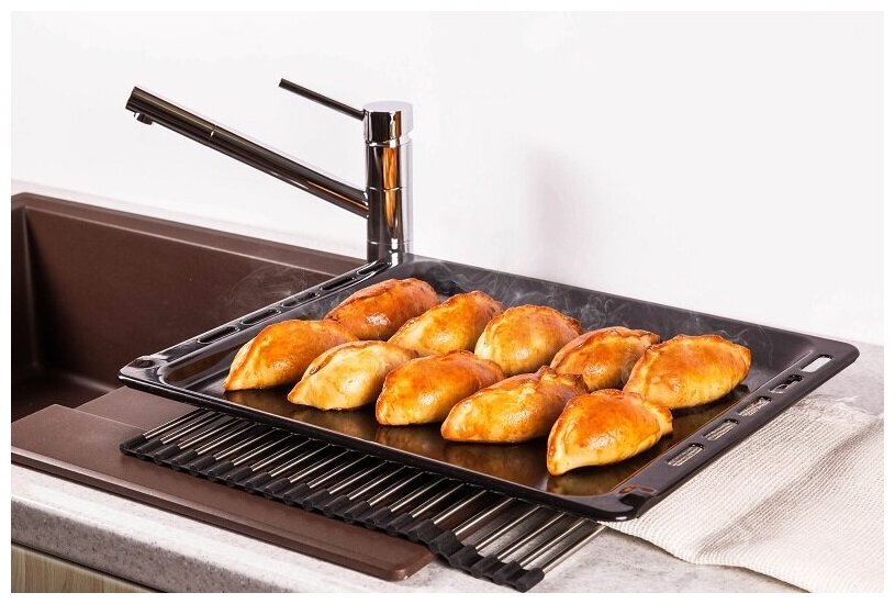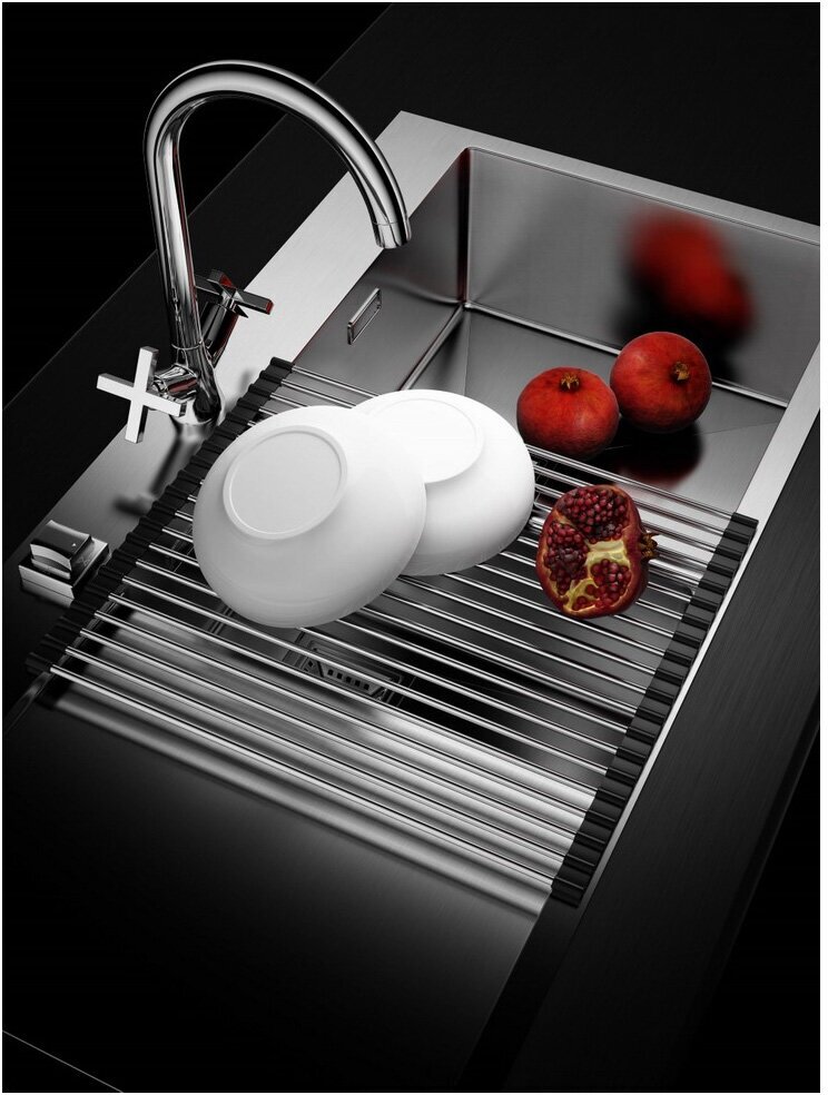 Стильный коврик можно расположить на крыле мойки или на столешнице для размещения горячих кастрюль, сковородок и увеличения пространства для сушки.