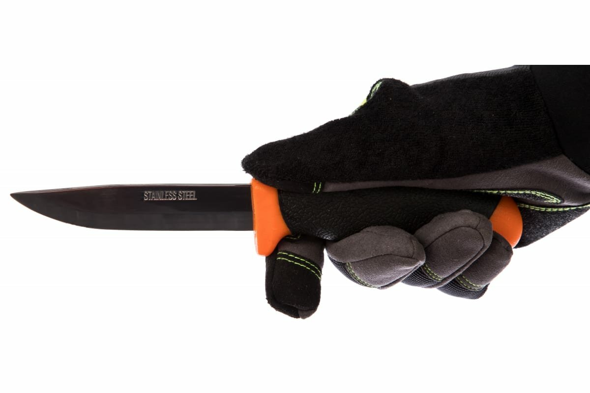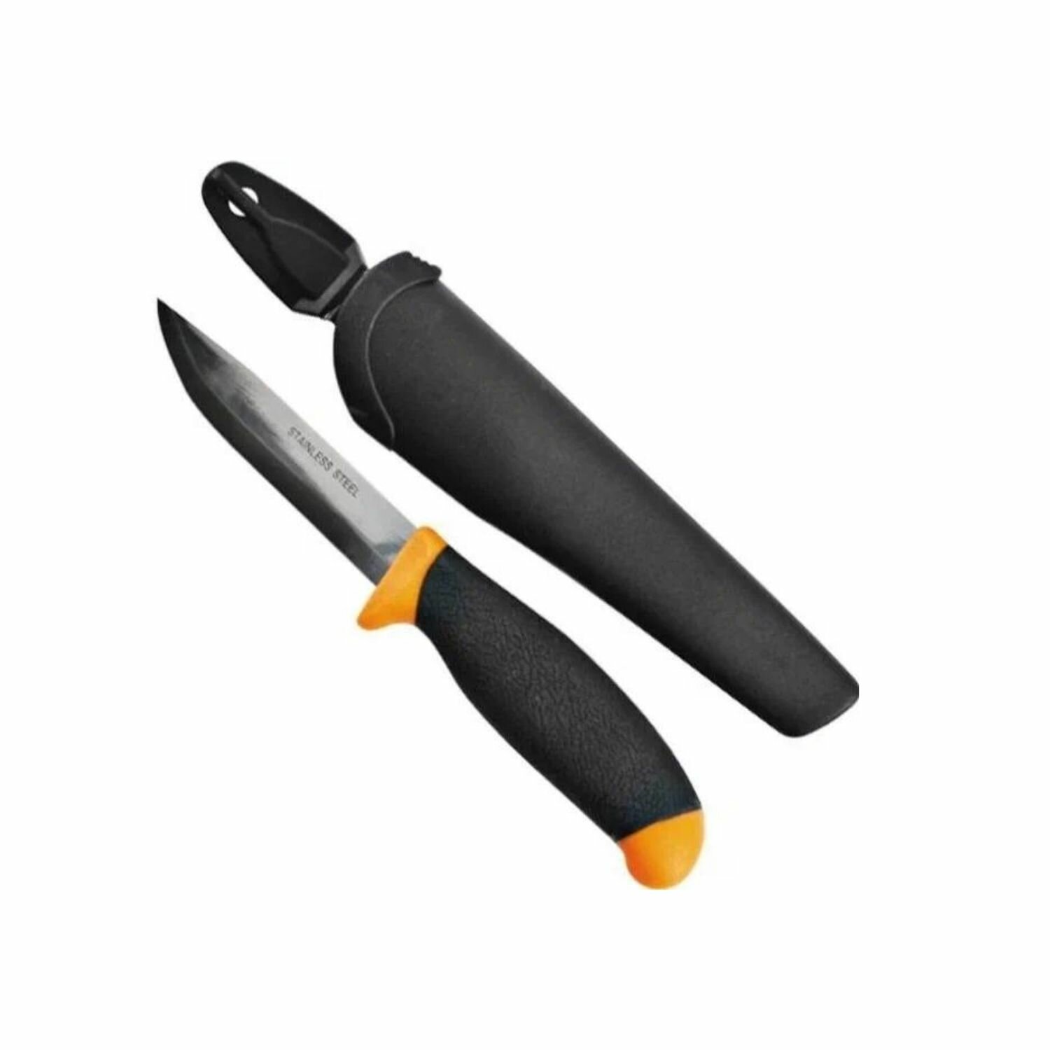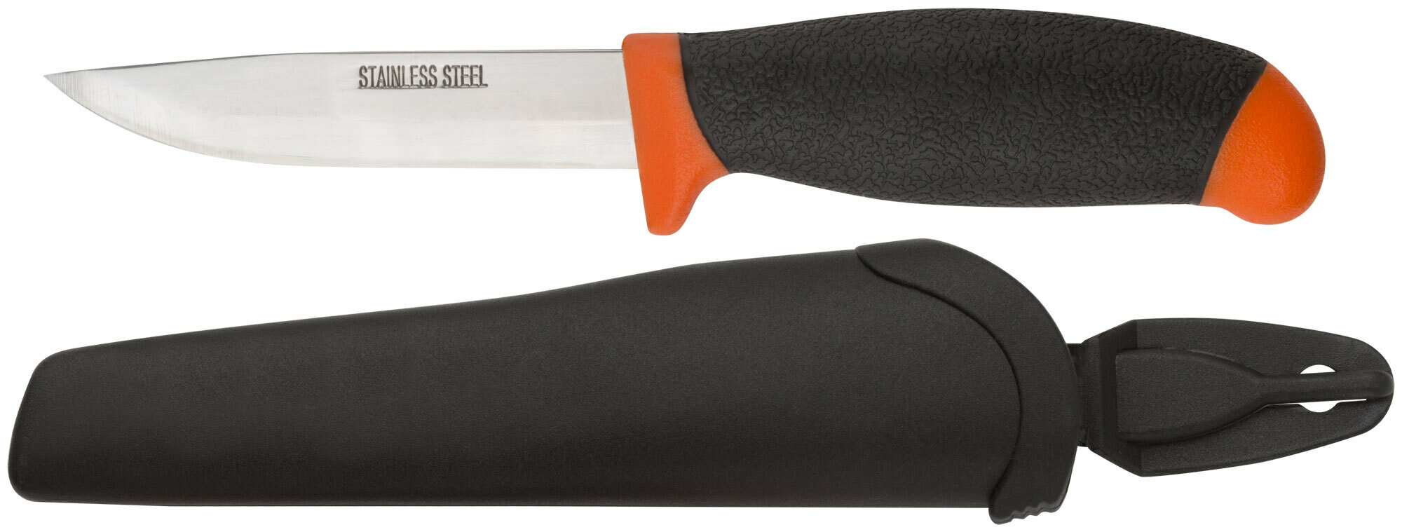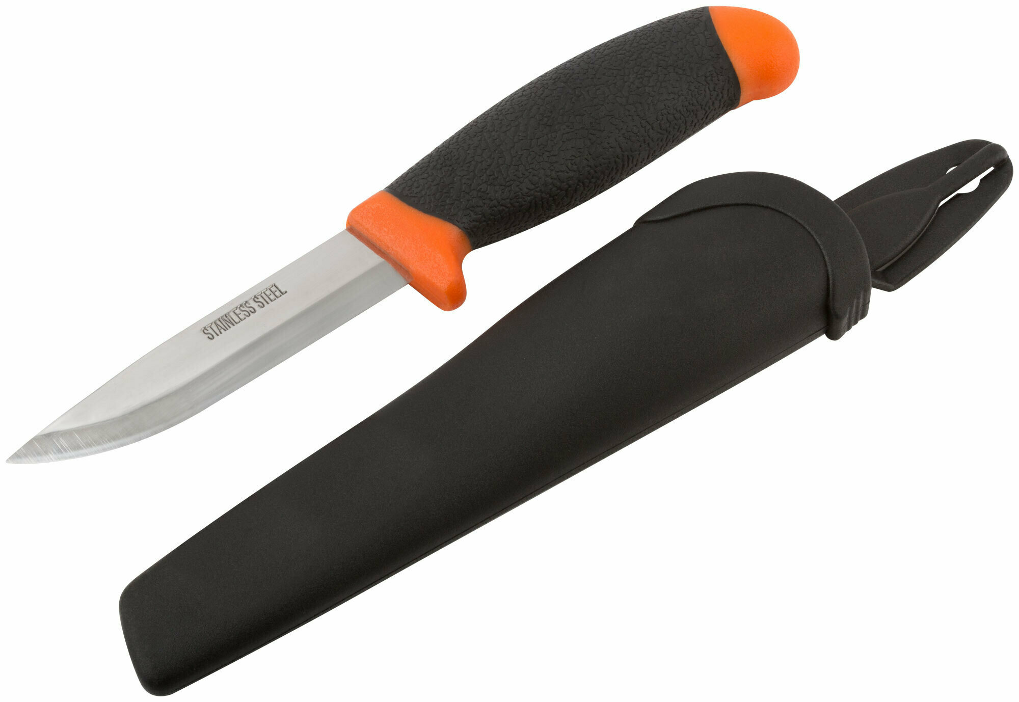 Многофункциональный нож с лезвием 100 мм. Материал: нержавеющая сталь, прорезиненная ручка, пластиковый чехол.