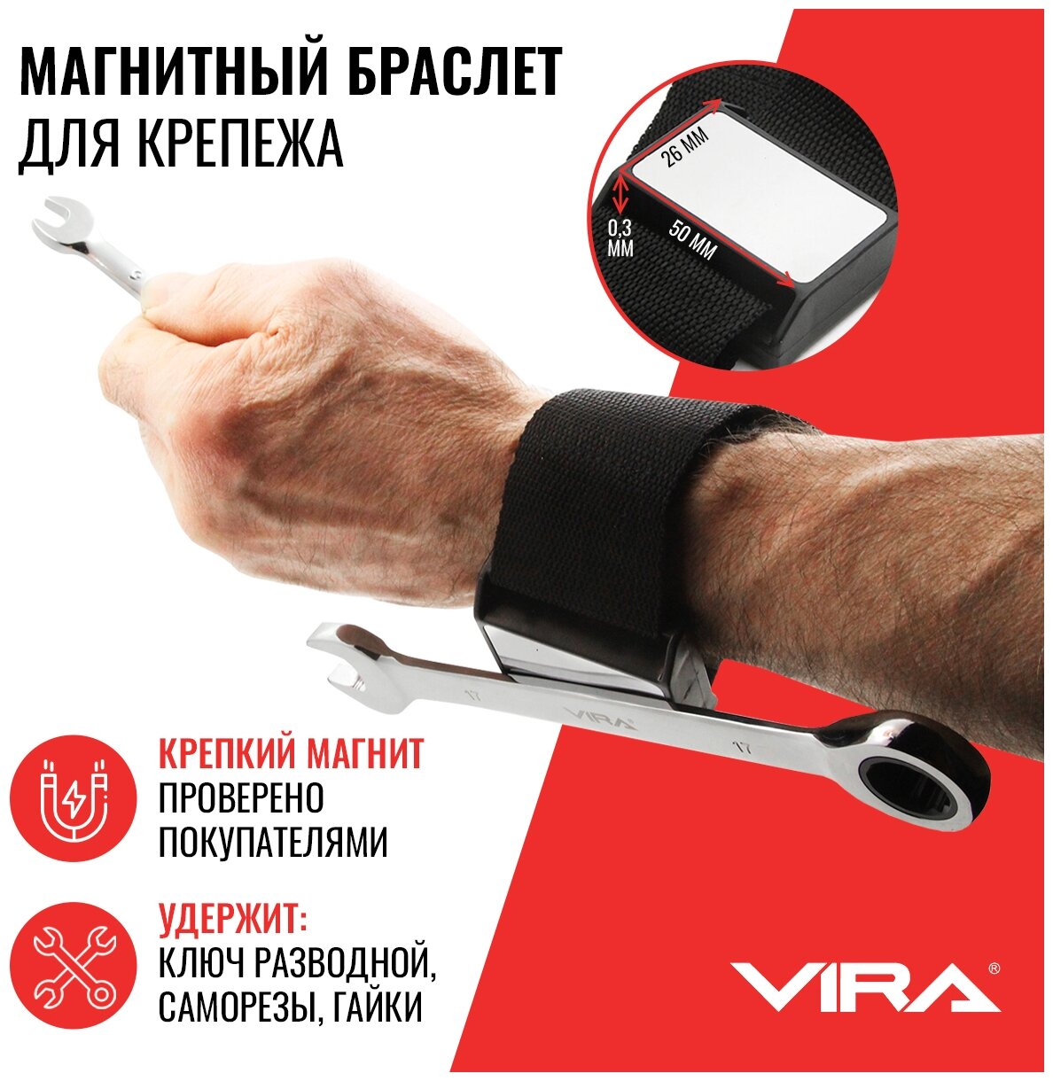 Vira - магнитный браслет, который нужен для удерживания на запястье мелких деталей сборки, винтов, гвоздей, гаек, болтов, саморезов, скоб, иголок, бит для отверток и т.д. Тканевый ремешок с текстильной застежкой (липучкой) проходит через проушины в плоском магните. Такое устройство браслета не позволит магниту случайно потеряться, и оторвать его тоже сложно. Браслет подойдет для тех, кто часто работает с мелким и средним крепежом и не хочет его терять, случайно рассыпать во время работы. Или для тех, кто использует большое количество деталей и крепежа одновременно и хочет, чтобы нужные элементы всё время были под рукой. Конечно, браслет полезен тем, кто трудится на стремянке или строительных лесах и не может часто спускаться на землю за металлическими расходниками. При использовании магнитного браслета, можно освободить ваши руки от удерживания мелких деталей и задействовать их в полезной работе.
