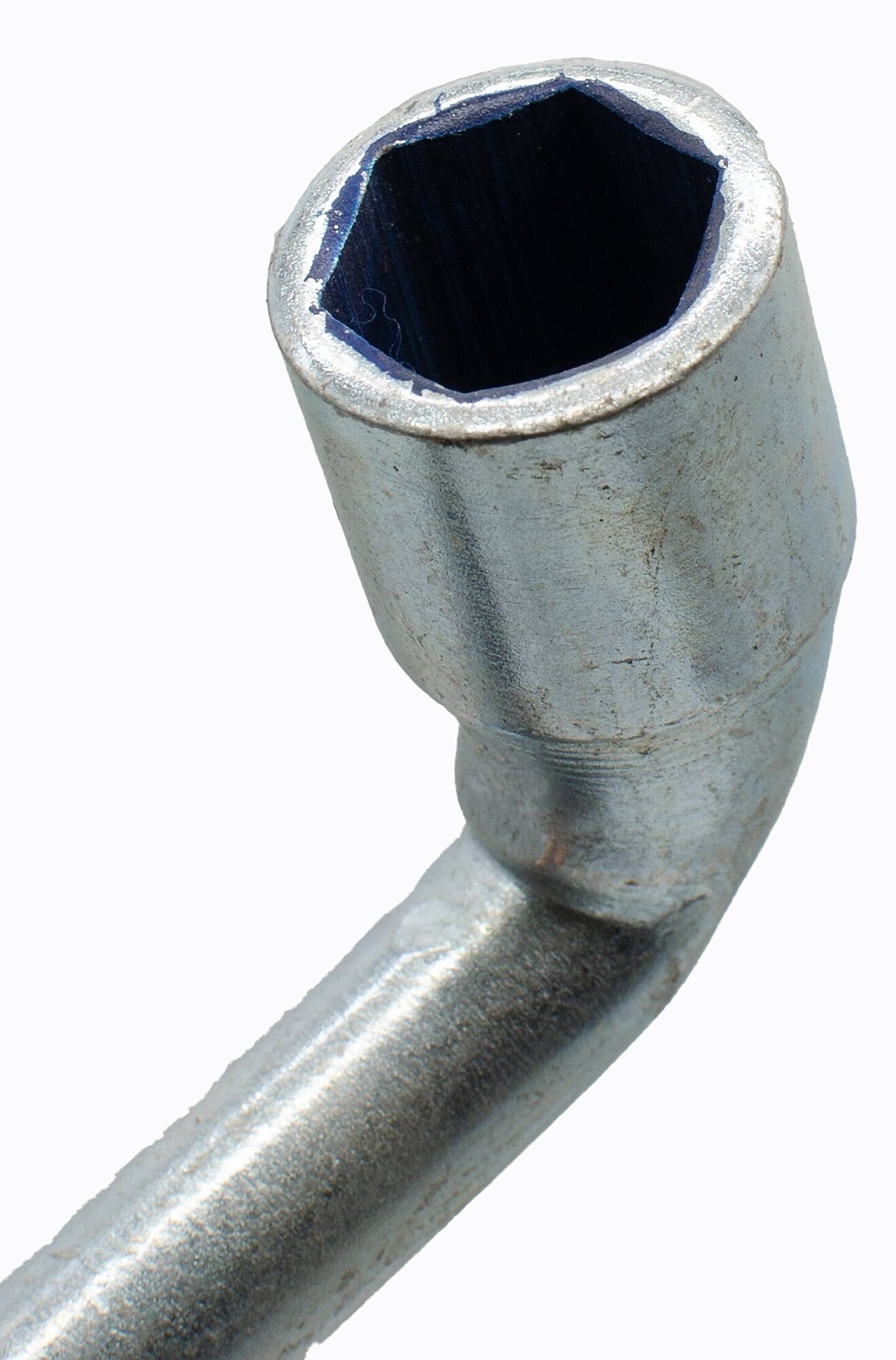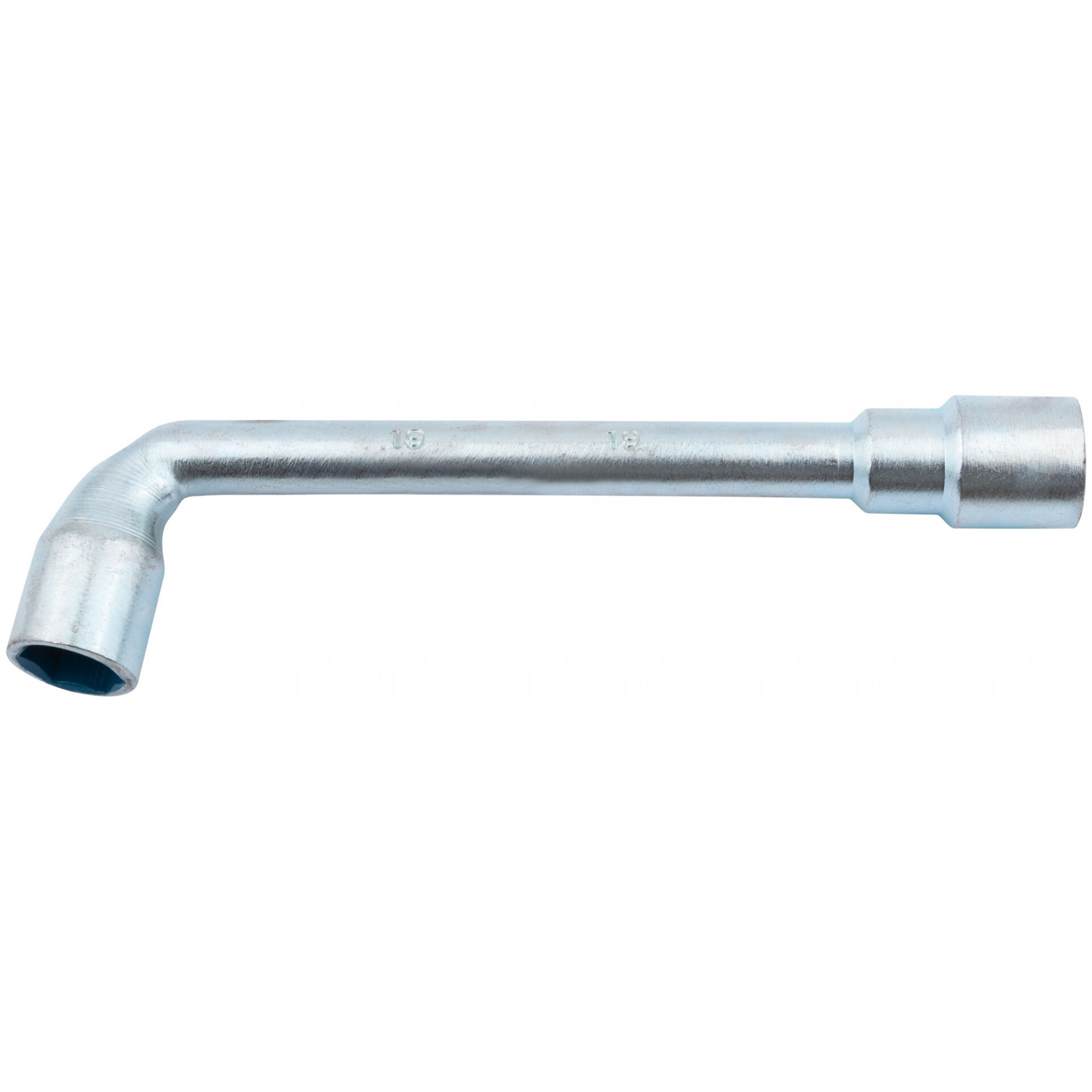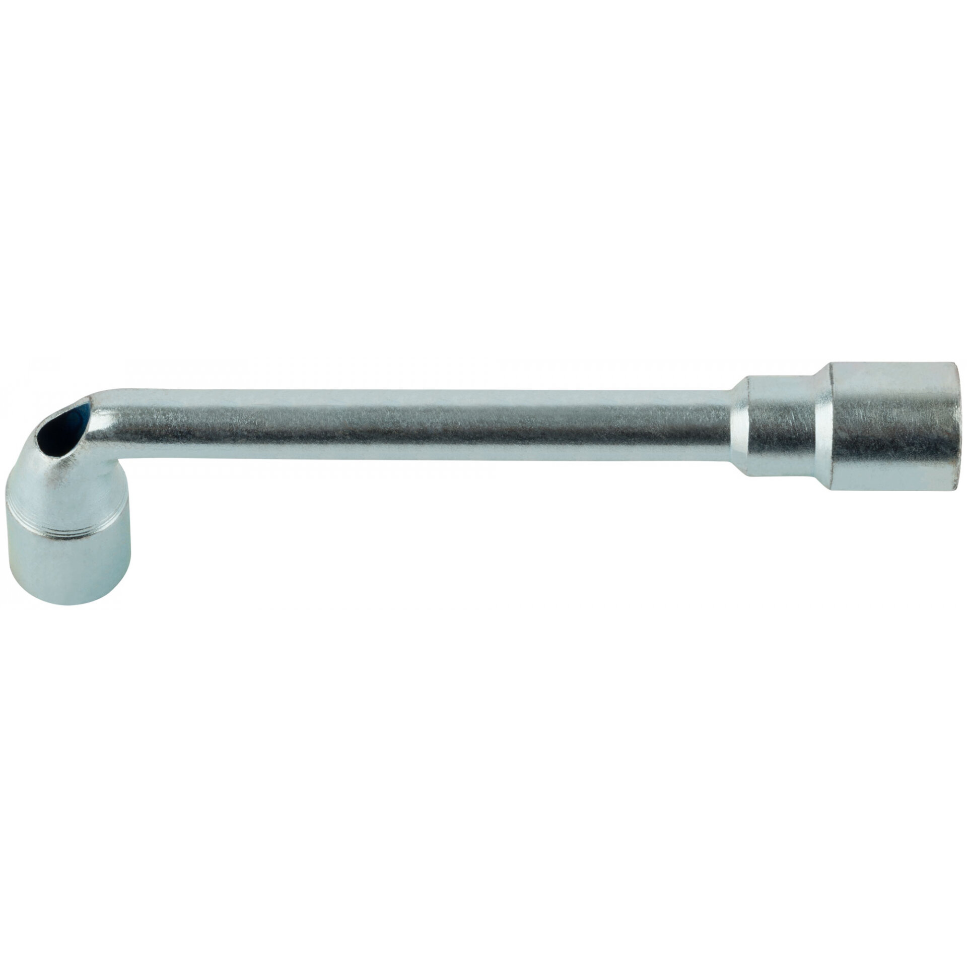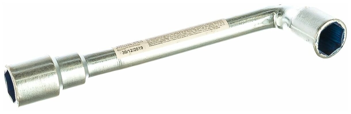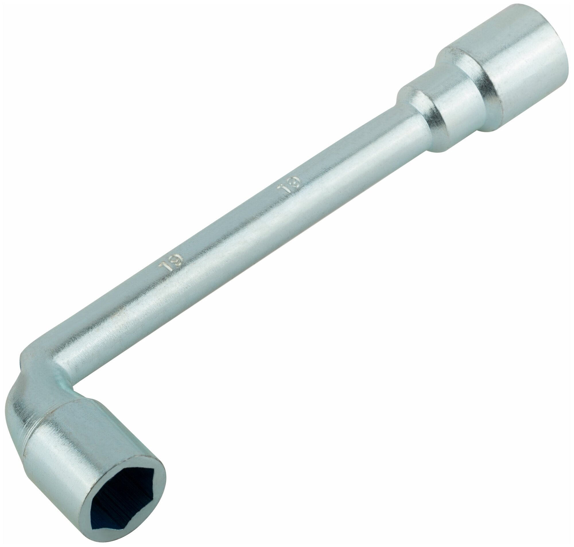 Ключ торцевой L-образный двухсторонний «Стандарт». Отверстие в ключе позволяет скручивать гайки с длинных шпилек. Материал: инструментальная сталь.