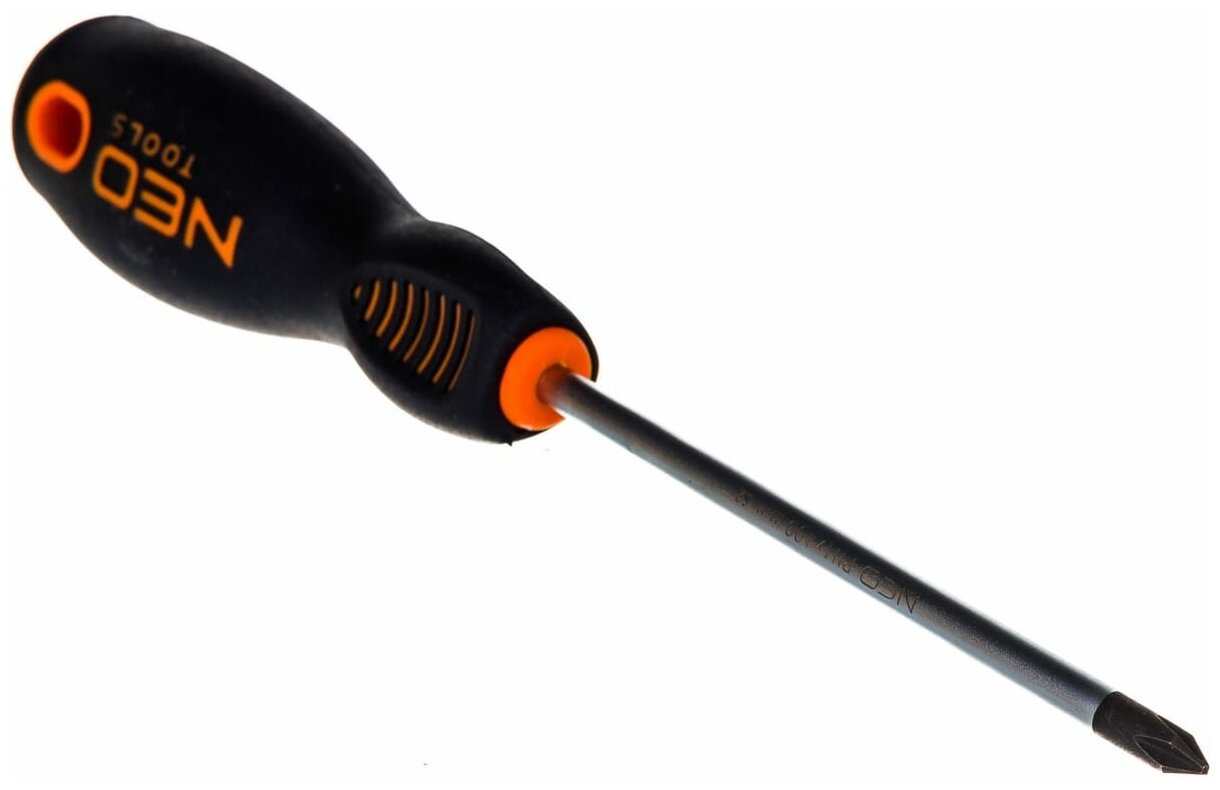 Отвертка крестовая PH NEO. Стержень отвертки изготовлен из чрезвычайно прочной стали марки S2. Рабочая часть подвергнута термообработке, благодаря чему получена требуемая твердость и стойкость к изгибу 56 HRC. Отвертка с намагниченным жалом. Трехгранная форма рукоятки с профилированной опорой для большого пальца уменьшает нагрузку на ладонь во время работы и облегчает быстрое вращение отвертки. Двухкомпонентная рукоятка предотвращает скольжение в ладони, стойкая к воздействию химических веществ, масел и смазок. Качество инструмента подтверждено сертификатом TUV и 25-летней гарантией производителя. Бренд NEO оправдывает ожидания профессионалов.