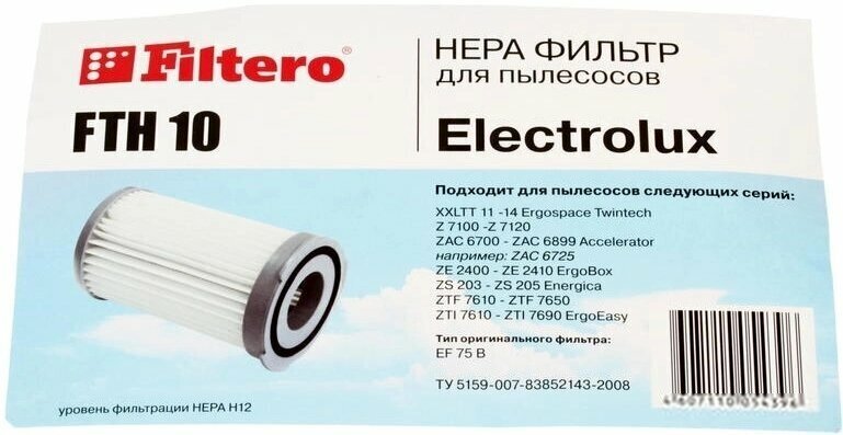 Фильтр ''Filtero FTH 10'' уровня фильтрации нера Н 12. Препятствует выходу мельчайших частиц пыли и аллергенов из пылесоса в помещение. Фильтр немоющийся. Подлежит замене, согласно рекомендации производителя пылесосов - не реже одного раза за 6 месяцев.