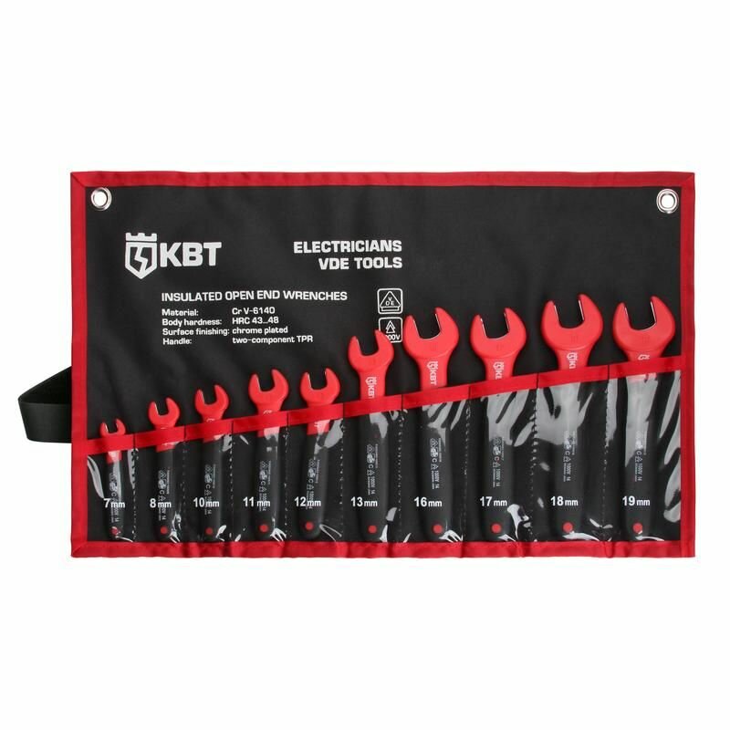 | Прочие особенности и свойства | Для работы под напряжением до 1000 В,Материал изоляции:полипропилен,Изолирующее покрытие, нанесенное в термопластавтоматах, гарантирует высокие изоляционные свойства и надежность VDE инструмента,Инструментальная хром-ванадиевая сталь,Двухкомпонентные рукоятки с прорезиненным нескользящим покрытием,Маркировка типоразмера и VDE-сертификациипо IEC 609000 — на каждом ключе,Прочная и удобная раскладная сумка с ремнем-липучкой и крепежными отверстиями под евростенды |