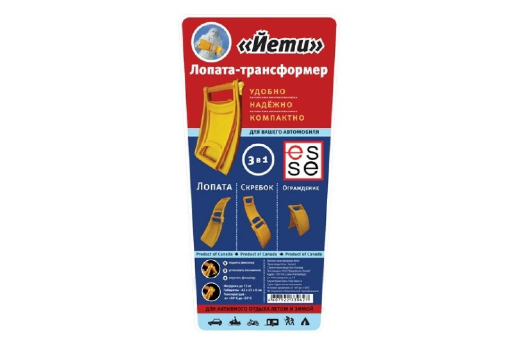| Прочие особенности и свойства | Может использоваться в качестве лопаты, скребка и ограждения (или предупреждающего знака). Инструмент станет прекрасным помощником для туризма, активного отдыха на природе зимой и летом. Подходит для хранения в автомобиле и использования в дорожных условиях. Лопатка идеальна для очистки небольших пространств от снега, а скребок поможет сгрести песок, листья или рыхлый снег. Если на корпус изделия наклеить специальные знаки или светоотражающие полоски, то его можно использовать в качестве предупреждения об опасности. |