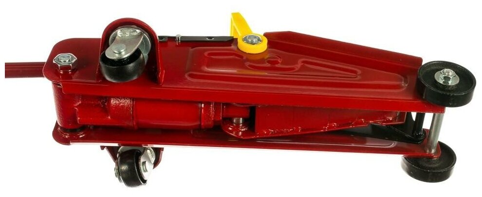 Сам домкрат тоже оснащен пластиковой ручкой и металлическими колесами. В сложенном состоянии высота устройства 13,5 см. Вес самого домкрата — 7,7 кг.