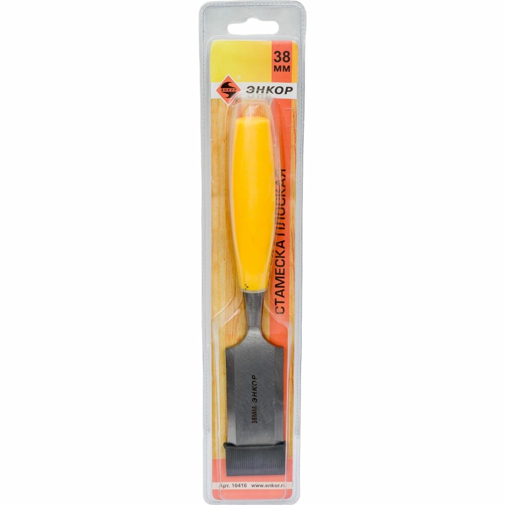 Стамеска-долото 38 мм Энкор 10456 - инструмент для строгания деревянных заготовок, прорезания отверстий и пазов, обработки фасок и т. д. Лезвие плоской формы выполнено из качественной стали. Пластиковая рукоятка делает рабочий процесс более удобным. Внутри неё расположен металлический стержень. Для смягчения ударов между стержнем и телом инструмента предусмотрена полость. Стамески плоские и сертифицированы в РФ. Упаковка стамесок - пластиковый прозрачный блистер. Предназначены для работы с мягкой и твёрдой древесиной. Полотно из качественной легированной стали, Рабочая часть закалена до 58 HRC, Рукоятка из ударопрочной пластмассы, но рекомендуется аккуратно работать киянкой. Лезвие стамески защищено съемным колпачком из пластмассы, что удобно и безопасно при работе и транспортировке,