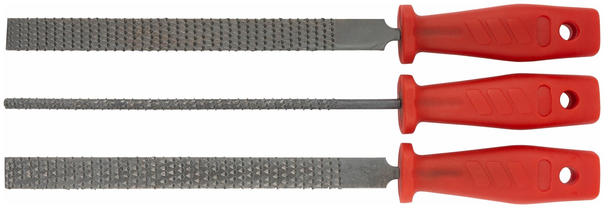 | Подробный состав комплекта | Рашпили с пластиковой ручкой, набор 3 шт.:круглый, п/круглый, плоский |