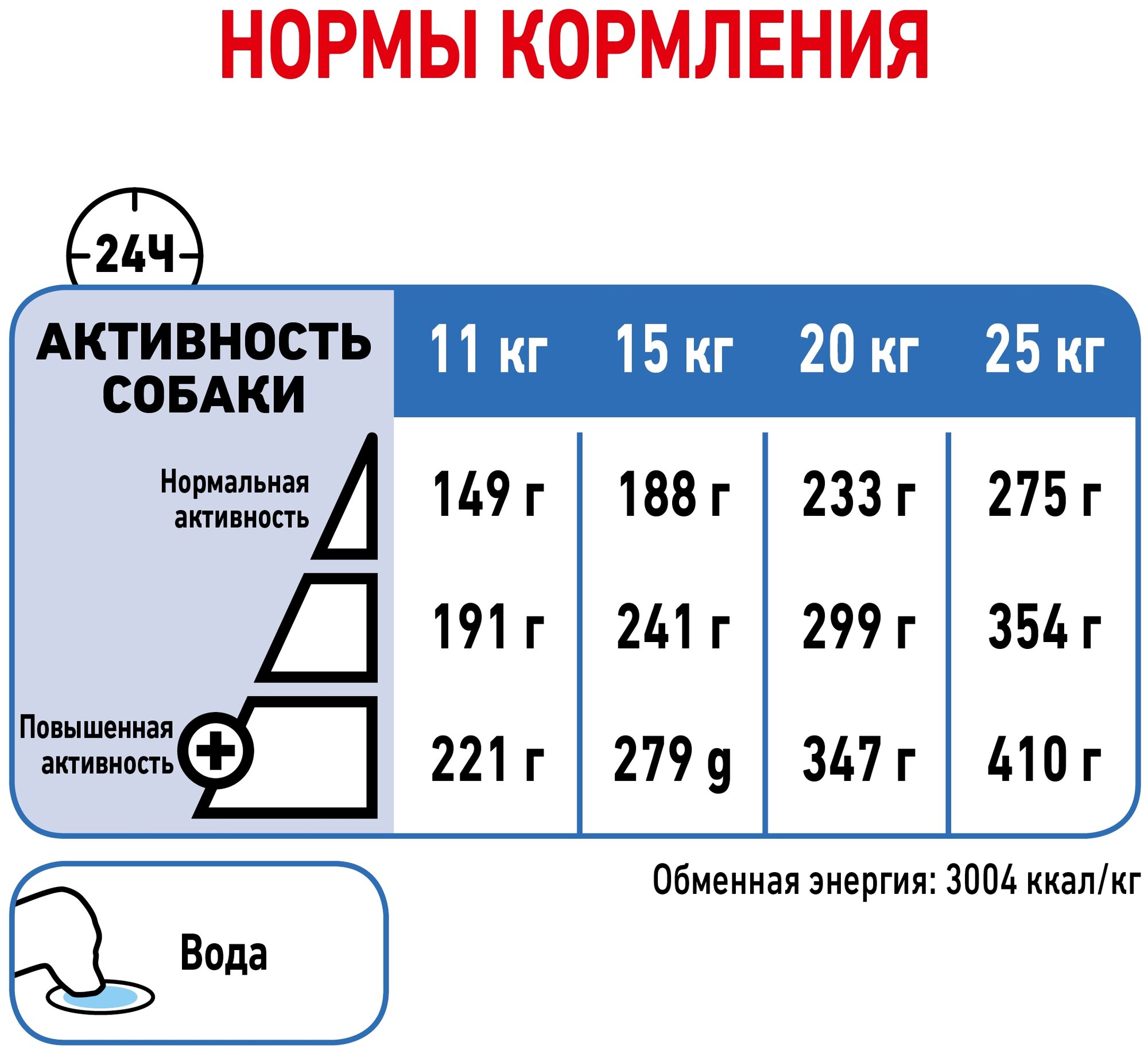 | Рекомендации | Суточная норма указана в граммах (г) или мерных стаканах (ст). Проследите, чтобы у вашей собаки всегда была свежая вода. Вес собаки Обычная активность Умеренная активность Повышенная активность 11 кг 156 г 186 г 215 г 1+7/8 ст 2+2/8 ст 2+5/8 ст 12 кг 167 г 198 г 230 г 2 ст 2+3/8 ст 2+7/8 ст 14 кг 188 г 223 г 258 г 2+2/8 ст 2+6/8 ст 3+1/8 ст 16 кг 207 г 246 г 285 г 2+4/8 ст 3 ст 3+4/8 ст 18 кг 226 г 269 г 311 г 2+6/8 ст 3+2/8 ст 3+6/8 ст 20 кг 245 г 291 г 337 г 3 ст 3+5/8 ст 4+1/8 ст 22 кг 263 г 313 г 362 г 3+2/8 ст 3+7/8 ст 4+3/8 ст 24 кг 281 г 334 г 386 г 3+4/8 ст 4+1/8 ст 4+6/8 ст 25 кг 290 г 344 г 398 г 3+4/8 ст 4+2/8 ст 4+7/8 ст * Ориентируйтесь на суточный рацион, указанный на упаковке продукта |