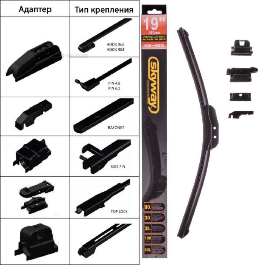 Щетка стеклоочистителя бескаркасная 48см/19" SKYWAY 1шт. 5 адаптеров - бескаркасные щетки с 5 адаптерами подходят для любого автомобиля и обеспечивают равномерное очищение всей поверхности стекла. Благодаря технологическому усовершенствованию, щетки SKYWAY способны удалять даже самые мелкие частицы воды. Натуральный каучук, из которого произведены щетки, и графитовое напыление позволяют значительно снизить уровень шума, а также увеличивают срок службы. Резина щеток остается эластичной в разных погодных условиях и под действием реагентов. Щетка плотно прилегает к стеклу даже на большой скорости, надежно защищая его от загрязнений.