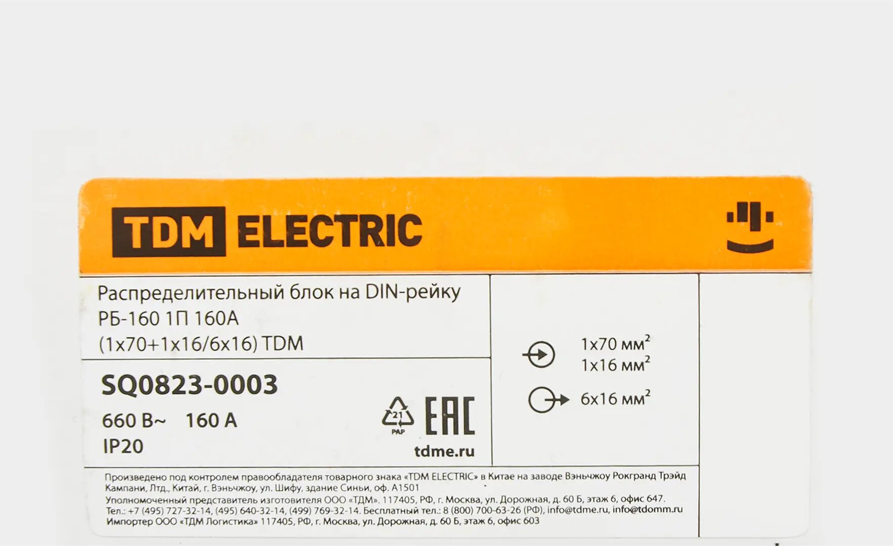 **Распределительный блок на DIN-рейку TDM Electric РБ-160 1П** предназначен для создания упорядоченных систем распределения в электрощитах, структурированного подключения отводных линий. Корпус изготовлен из полиамидного материала, не поддерживающего горения, контакты — из луженой меди.
