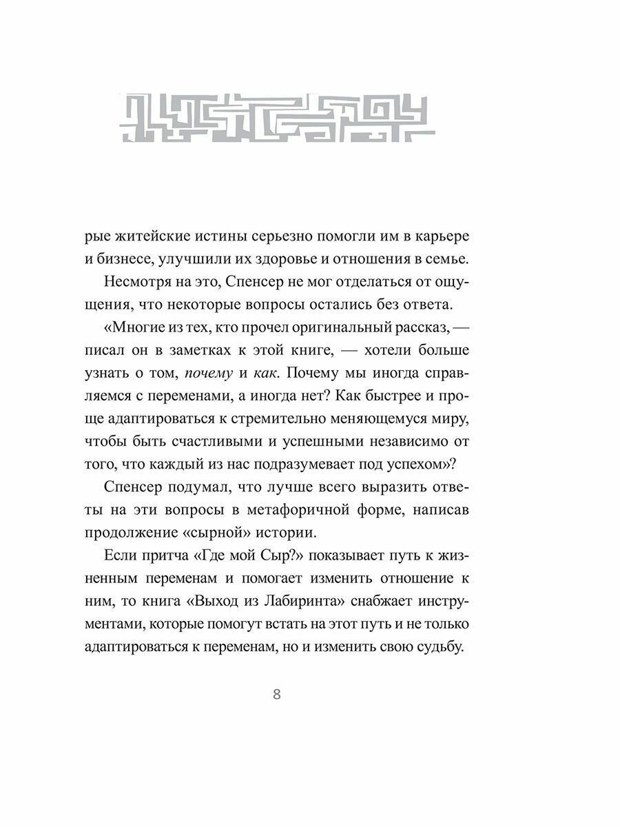 Если "Где мой Сыр?" показывает путь к жизненным переменам и помогает взглянуть на них по-новому, то "Выход из Лабиринта" предоставляет вам инструменты, которые помогут не только адаптироваться к переменам, но и полностью изменить свою судьбу.