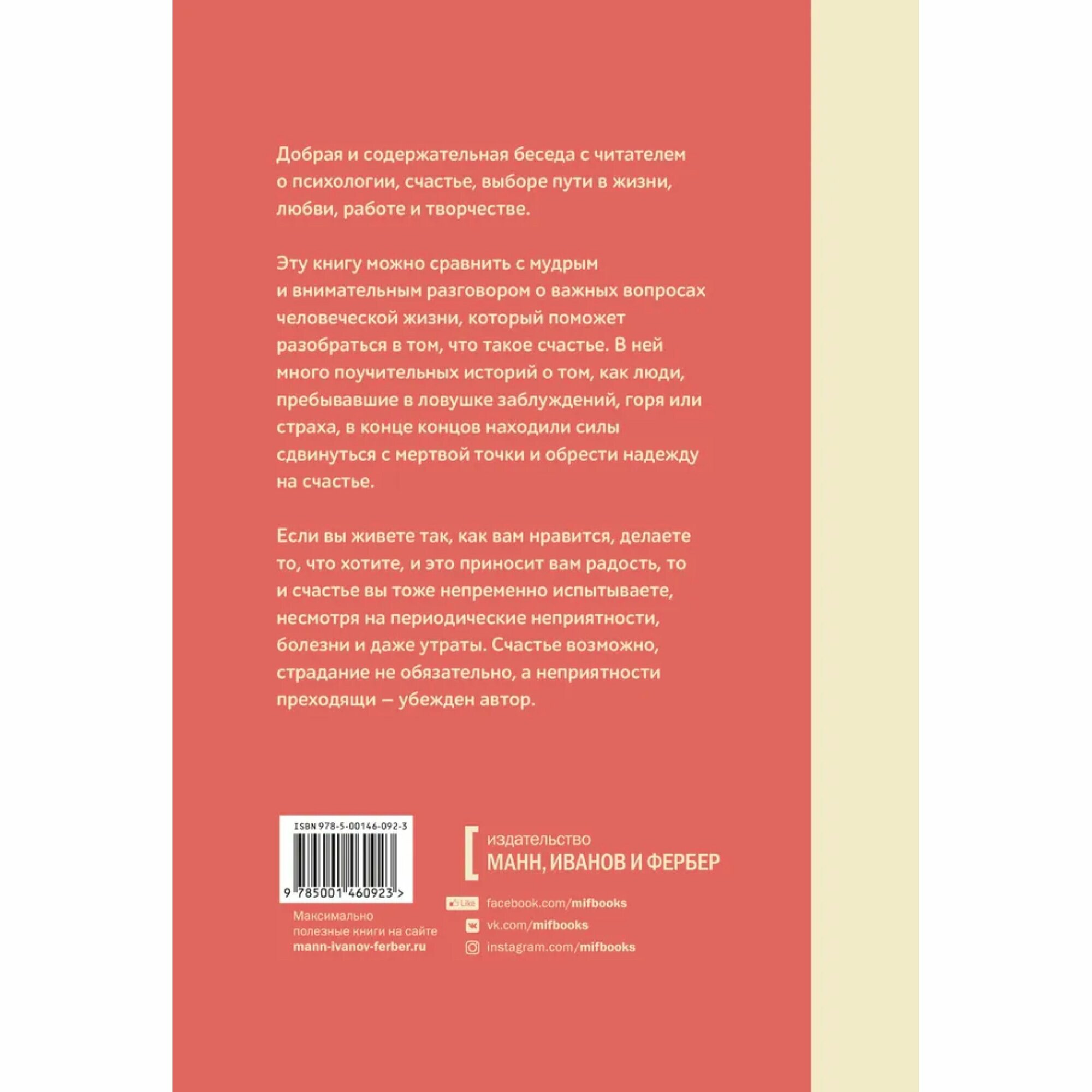 Если вы живете так, как вам нравится, делаете то, что хотите, и это приносит вам радость, то и счастье вы тоже непременно испытываете, несмотря на периодические неприятности, болезни и даже утраты. "Счастье возможно, страдание не обязательно, а неприятности преходящи", - убежден автор.
