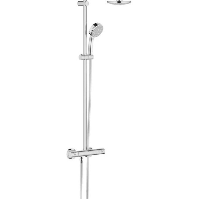 Grohe душевая система с термостатом. В наборе: душевая штанга, душ верхний, душ ручной, душевой шланг металлический 1750 мм, термостат. Диаметр верхней душевой лейки 160 мм. Автоматический переключатель душ верхний/душ ручной. С системой SpeedClean против известковых отложений. Монтаж настенный.