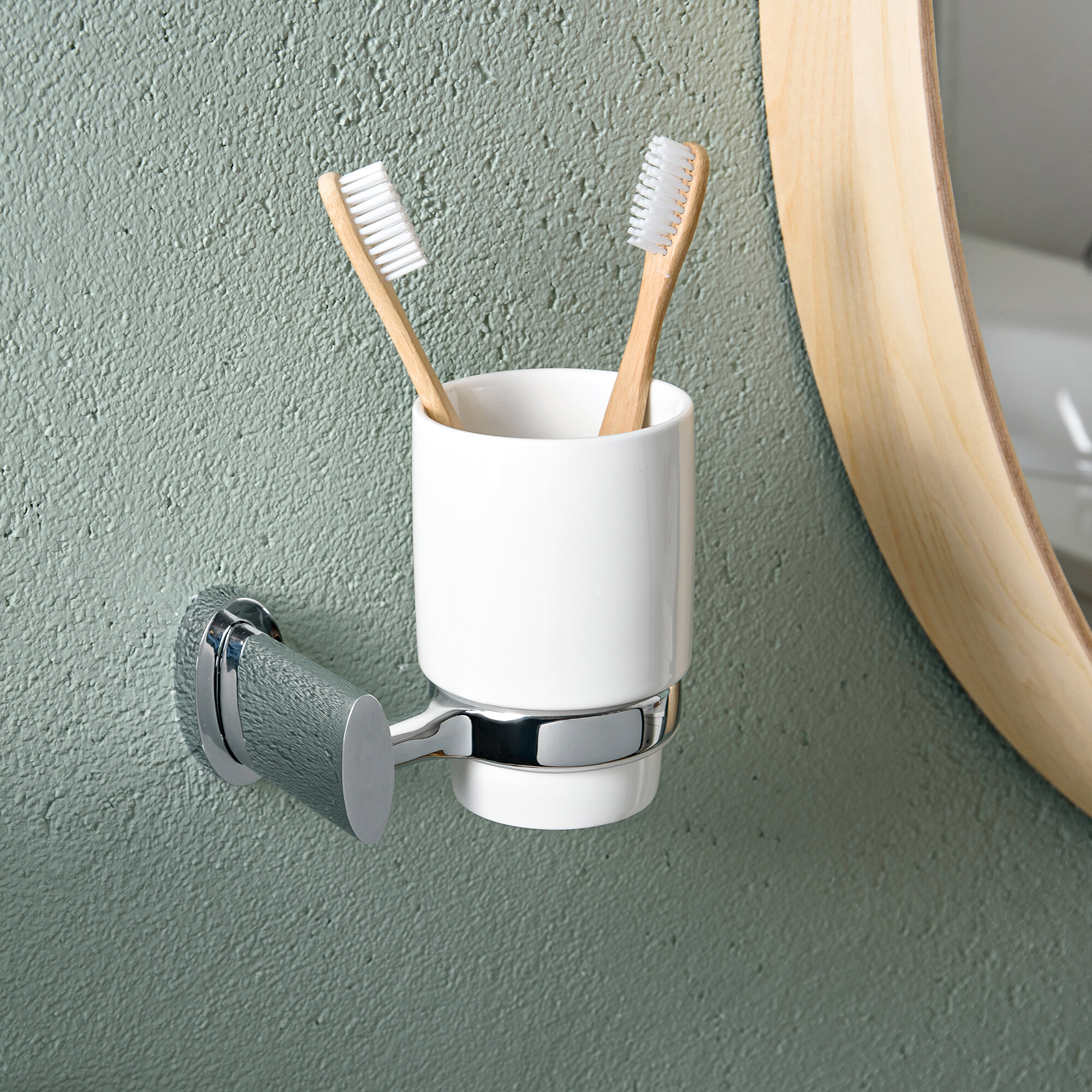 Стакан для хранения зубных щеток Ellips оснащен металлическим держателем настенного типа. Сам стакан изготовлен из высокопрочной керамики и покрыт молочно-белой глазурью. Все металлические элементы способны выдержать длительное воздействие влаги, а также химических веществ. Изделие крепиться к стене при помощи шурупов, которые входят в комплект.
