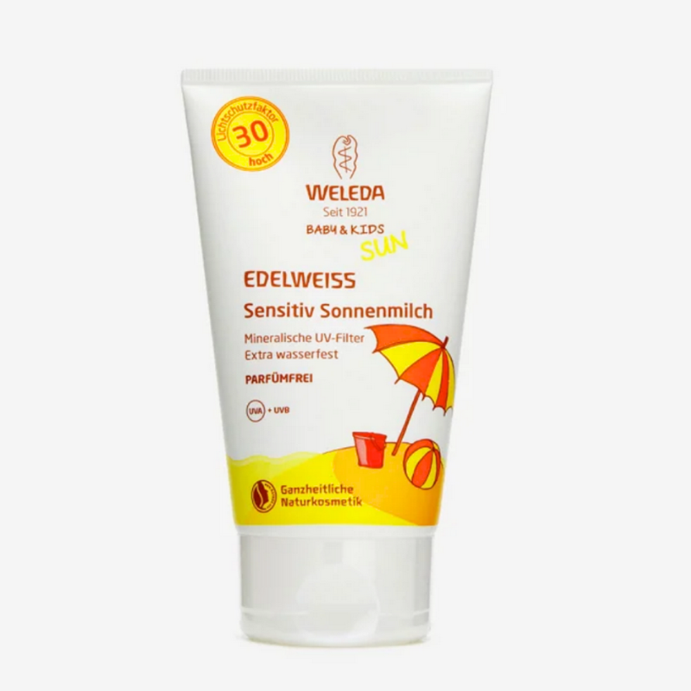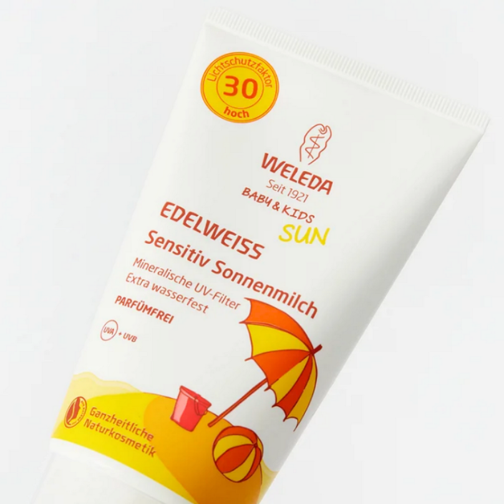 Высокая степень защиты. Не содержит химических фильтров. Водоустойчивый солнцезащитный крем с экстрактом горного эдельвейса обеспечивает мгновенную защиту чувствительной коже ребенка. Минеральные УФ-фильтры бережно защищают от вредных ультрафиолетовых лучей, а органические экстракты подсолнечника и кокосового масла надежно удерживают влагу в коже. Средство не содержит химических действующих веществ и отдушек, подходит для самой чувствительной кожи малышей, клинически протестировано.