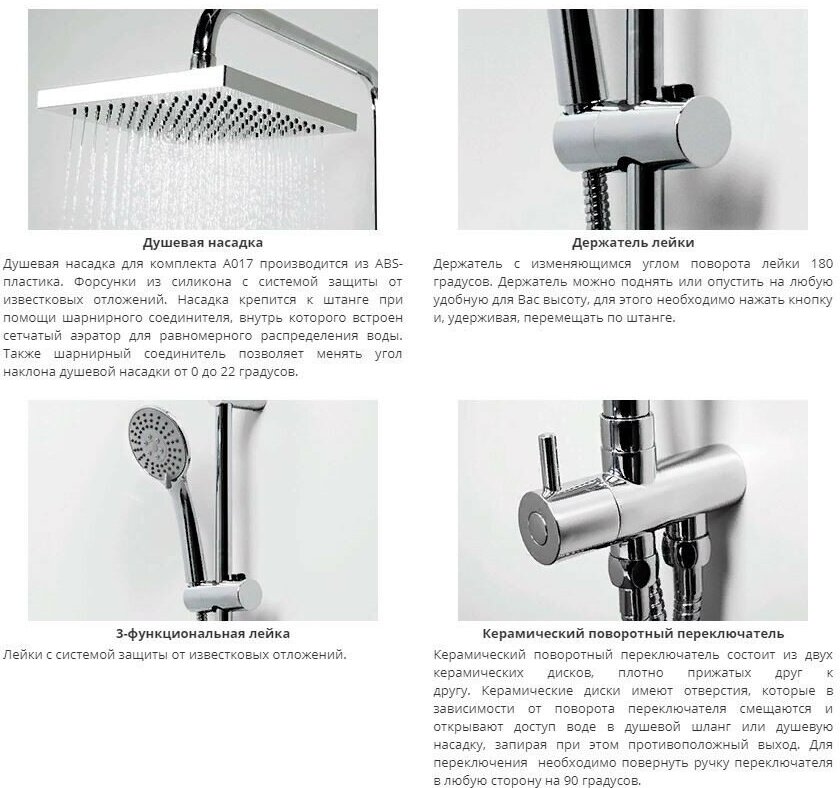Душевая насадка для комплекта А017 производится из ABS-пластика. Форсунки из силикона с системой защиты от известковых отложений. Насадка крепится к штанге при помощи шарнирного соединителя, внутрь которого встроен сетчатый аэратор для равномерного распределения воды. Также шарнирный соединитель позволяет менять угол наклона душевой насадки от 0 до 22 градусов.Держатель лейки