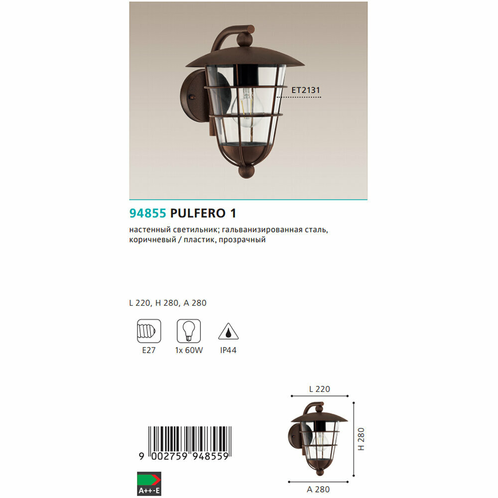 Настенный фонарь уличный Pulfero - продукт известной компании Eglo (Австрия). Имеет максимальную мощность 60 Вт, освещает площадь до 3 кв. м. Отлично подойдет для таких мест, как дача, фасад, веранда и беседка. Впишется в интерьеры следующих стилей: лофт, модерн.