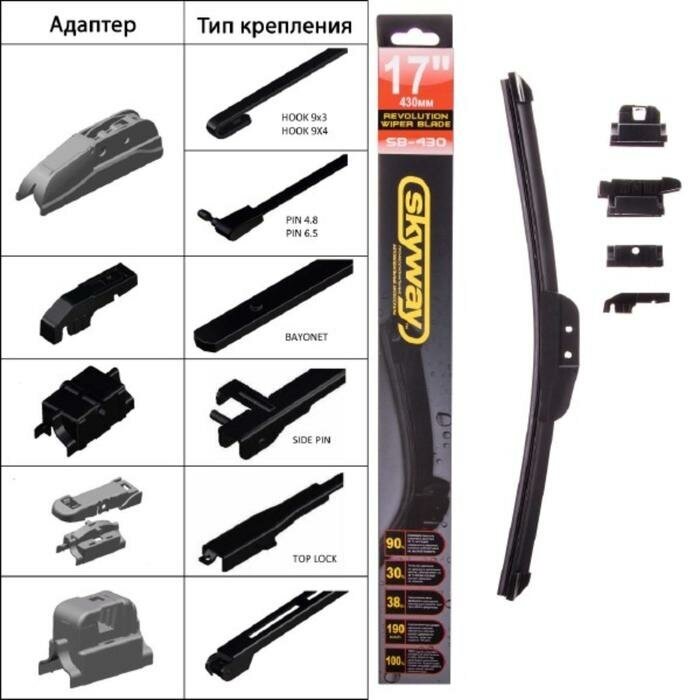Щетка стеклоочистителя бескаркасная 70см/28" SKYWAY 1шт. 5 адаптеров - бескаркасные щетки с 5 адаптерами подходят для любого автомобиля и обеспечивают равномерное очищение всей поверхности стекла. Благодаря технологическому усовершенствованию щетки SKYWAY способны удалять даже самые мелкие частицы воды. Натуральный каучук, из которого произведены щетки, и графитовое напыление позволяют значительно снизить уровень шума, а также увеличивают срок службы. Резина щеток остается эластичной в разных погодных условиях и под действием реагентов. Щетка плотно прилегает к стеклу даже на большой скорости, надежно защищая его от загрязнений.Особенности:Благодаря простоте установки адаптера, 90 % чистящей поверхности дворника остаётся рабочей даже на высокой скорости.Точечное давление на дворник в нескольких местах обеспечивает на 30% более плотный контакт дворника со стеклом.Уменьшение веса дворника и улучшение конструкции снизили шум при работе дворников.Аэродинамичный дизайн дворника позволяет обеспечить хороший контакт дворника со стеклом, даже при скорости 190 км/ч.Установка:Подберите необходимый Вам адаптер.Возьмите дворник пальцами с обеих сторон.Подведите дворник так, чтобы крюк упёрся в верхний край крепления.Надавите на крюк так, чтобы он провалился в крепление.Потяните дворник в сторону от крюка, пока он не защёлкнется.Закройте крышку крепления.Внимание: чтобы не препятствовать установке дворника, держите его снизу за лезвиеТип: бескаркасныйДлина: 70см/28"Количество адаптеров: 5 (Hook, Pin, Bayonet, Side Pin, Top Lock)