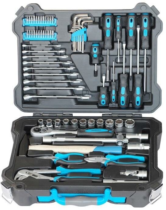 Набор инструментов Overhaul Набор инструмента универсальный, 73 предмета. Предлагаем вашему вниманию универсальный набор надежных инструментов из 72 предметов в чемодане. Стильный, закрывающийся на стальные замки кейс из специального пластика оборудован удобным выдвижным ящиком снизу для аккуратного размещения разнообразного крепежа и небольших инструментов. В этом ящике есть перегородки, которые можно переставить или удалить вовсе, что позволяет увеличить полезную площадь.