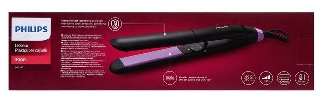 | Прочие особенности и свойства | Технология ThermoProtect обеспечивает оптимальную температуру сушки волос и их дополнительную защиту от перегрева. Длинные пластины обеспечивают лучший контакт с волосами и позволяют достичь идеальных результатов за более короткое время. Выпрямитель быстро нагревается и готов к использованию всего через 30 секунд после включения. 10 настроек температуры до 230 °C позволяют контролировать и настраивать температуру для вашего типа волос, защищая их от повреждения., , Выпрямитель оснащен специальным фиксатором, который расположен в основании прибора. Он фиксирует пластины, обеспечивая легкость и удобство хранения прибора и одновременно защищая выпрямитель от повреждений. Если оставить устройство включенным, оно автоматически отключится через 60 минут. |