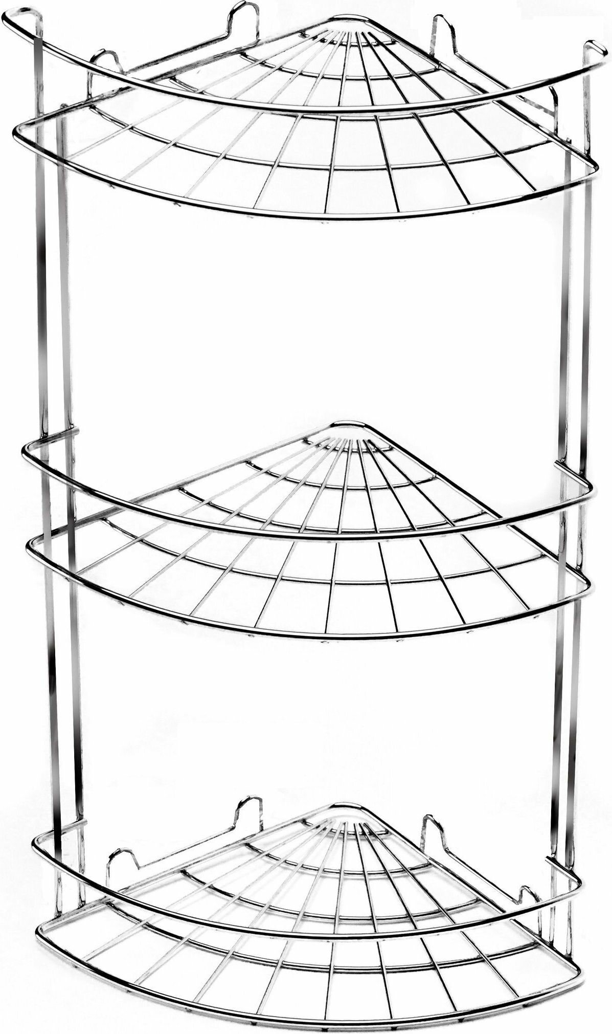 Полочка для ванной угловая, трехъярусная. Имеет хромированное покрытие, которое считается прочным и влагостойким во влажной среде. Монтажное крепление к стене осуществляется с помощью саморезов и дюбелей (входят в комплект).