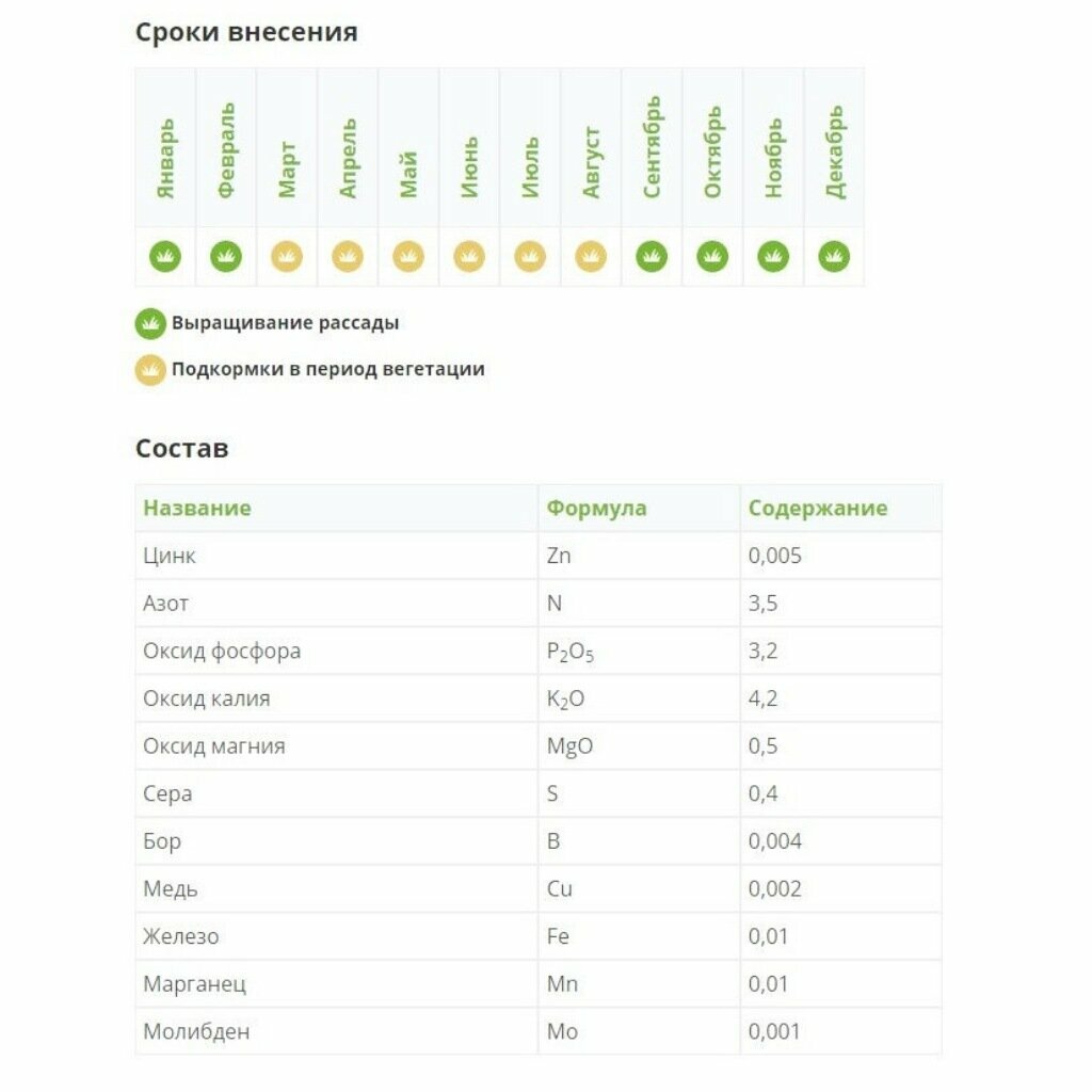 | Состав | N - 3,5 % P2O5 - 3,2 % K2O - 4,2 % MgO - 0,5 % S - 0,4 % B - 0,004 % Cu - 0,002 % Fe - 0,01 % Mn - 0,01 % Mo - 0,001 % Zn - 0,005 % |