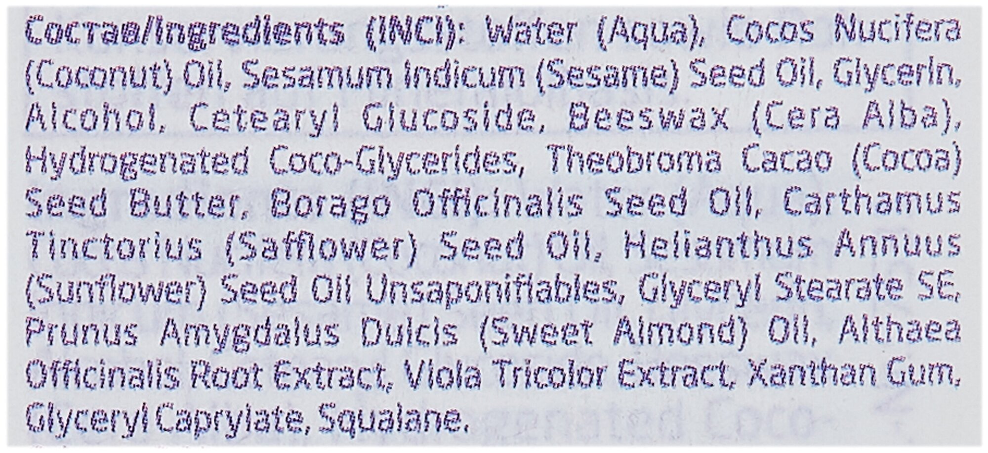 | Состав | Water (Aqua), Cocos Nucifera (Coconut) Oil, Sesamum Indicum (Sesame) Seed Oil, Glycerin, Alcohol, Cetearyl Glucoside, Beeswax (Cera Alba), Hydrogenated Coco-Glycerides, Theobroma Cacao (Cocoa) Seed Butter, Borago Officinalis Seed Oil, Carthamus Tinctorius (Safflower) Seed Oil, Helianthus Annuus (Sunflower) Seed Oil Unsaponifiables, Glyceryl Stearate SE, Prunus Amygdalus Dulcis (Sweet Almond) Oil, Althaea Officinalis Root Extract, Viola Tricolor Extract, Xanthan Gum, Glyceryl Caprylate, Squalane |