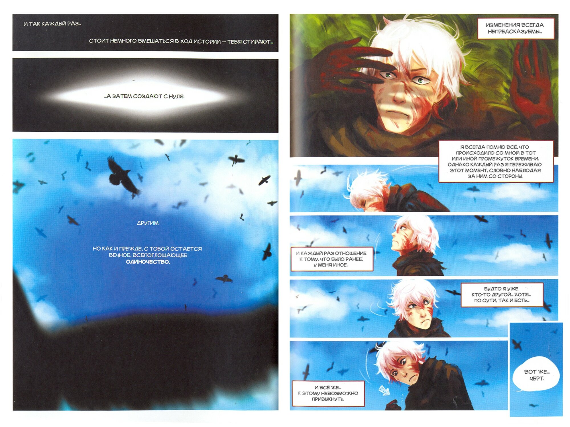 Ещё заметил интересную особенность... Даже не знаю: это задумка автора, или так получилось при печати. Если второе - то как. Дело в том, что зачастую текст в баблах кажется цветным, при этом цвет соответствует определённым персонажам (не у всех конечно, для многих текст стандартно чёрный), но если присмотреться под другим углом, то буквы становятся стандартно чёрными.