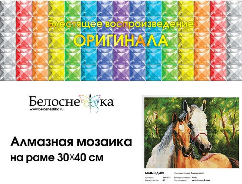 Прекрасные наборы для желающих попробовать себя в новом виде творчества, из полотна получается красивая мерцающая картина с природным сюжетом. Все сюжеты жизненные и авторские, разработаны по картинам современных российских художников. В комплект входят квадратные ограненные акриловые камни, которые расфасованы по цветам, на пакетах имеется наклейка с условным обозначением и номером. На холсте напечатана четкая цветная схема, поверх которой нанесен качественный клеевой слой, сверху клеевой слой защищает прозрачная пленка. Квадратная форма алмазных камней позволяет аккуратно заполнить картину и без единого пробела. Техника алмазной мозаики достаточно проста и увлекательна. Готовую работу можно смело ставить в раму и вешать на стену. В солнечный день алмазная мозаика вас прекрасно удивит своим блеском и переливанием. Размер: 30/40. Количество цветов: 45. Тип выкладки: 100% заполнение. Форма камней: квадратные 2,5*2,5 мм, 9 и 13 граней.