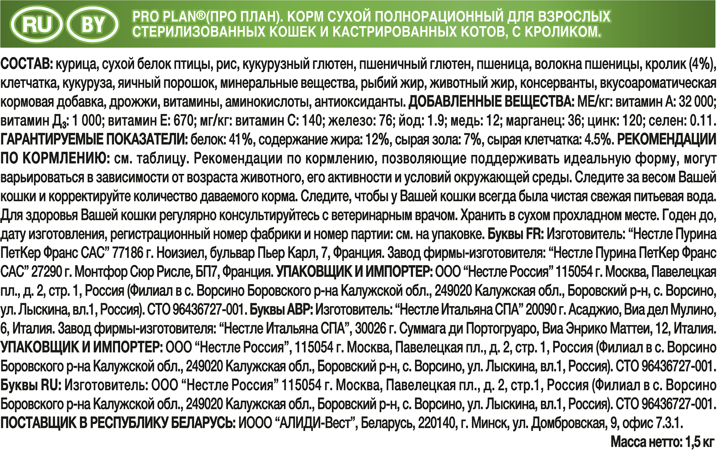 Корм для кошек Pro Plan для стерилизованных и кастрированных кролик сух. 10кг (размер: Для всех пород)