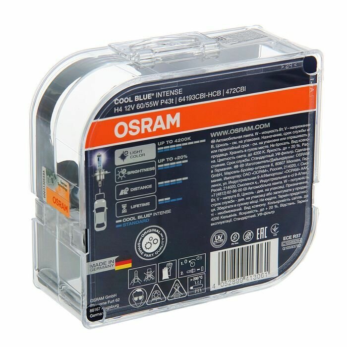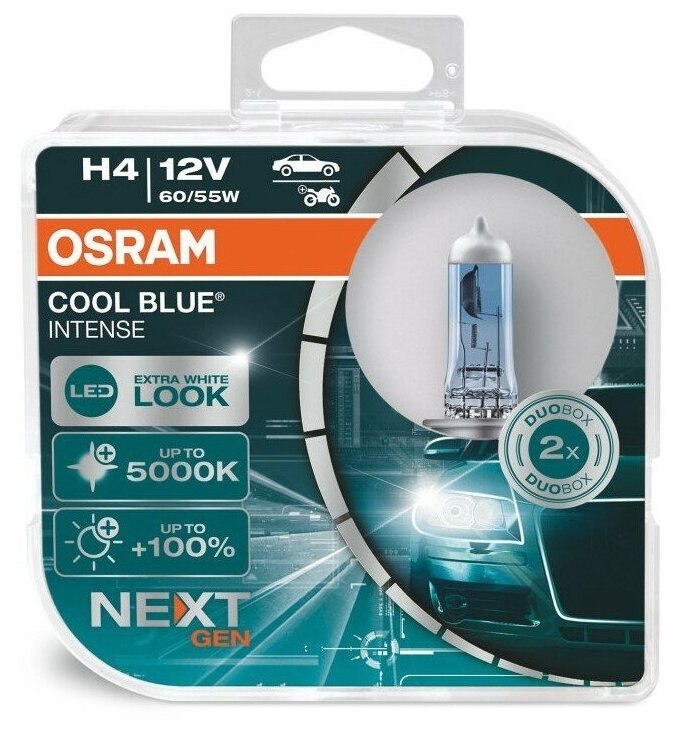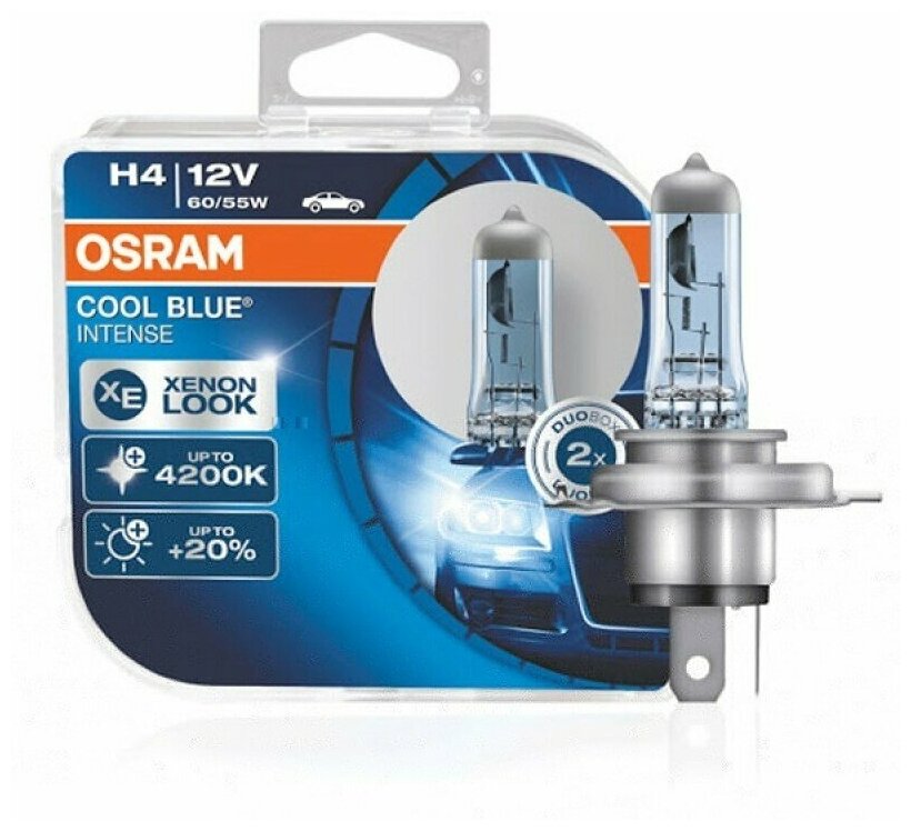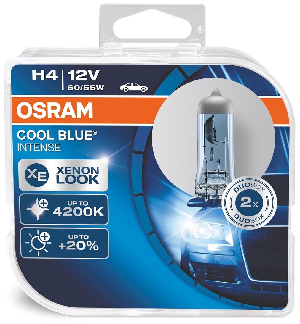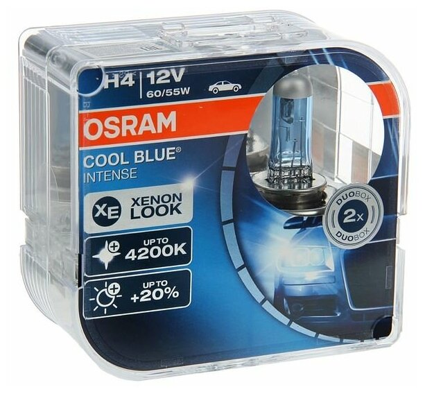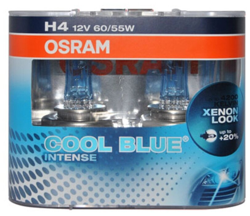 Голубовато-белый свет с цветовой температурой до 4200 К Откройте для себя высокотехнологичные галогенные лампы OSRAM COOL BLUE INTENSE, свет которых производит точно такое же впечатление, как свет стандартных ксеноновых ламп. Яркий нейтрально-белый свет, температура свечения которого достигает 4200K, придаст вашему автомобилю более стильный вид. Также свет этой лампы максимально приближен к естественному дневному свету, что делает его приятным для глаз и не вызывает усталости, в отличие от стандартных ламп. По сравнению со стандартными галогенными лампами OSRAM COOL BLUE INTENSE ярче на 20 процентов. Современный дизайн с серебристым колпачком (H4. H7. H11. HB4) делает эту лампу идеальным вариантом для полностью прозрачных фар.