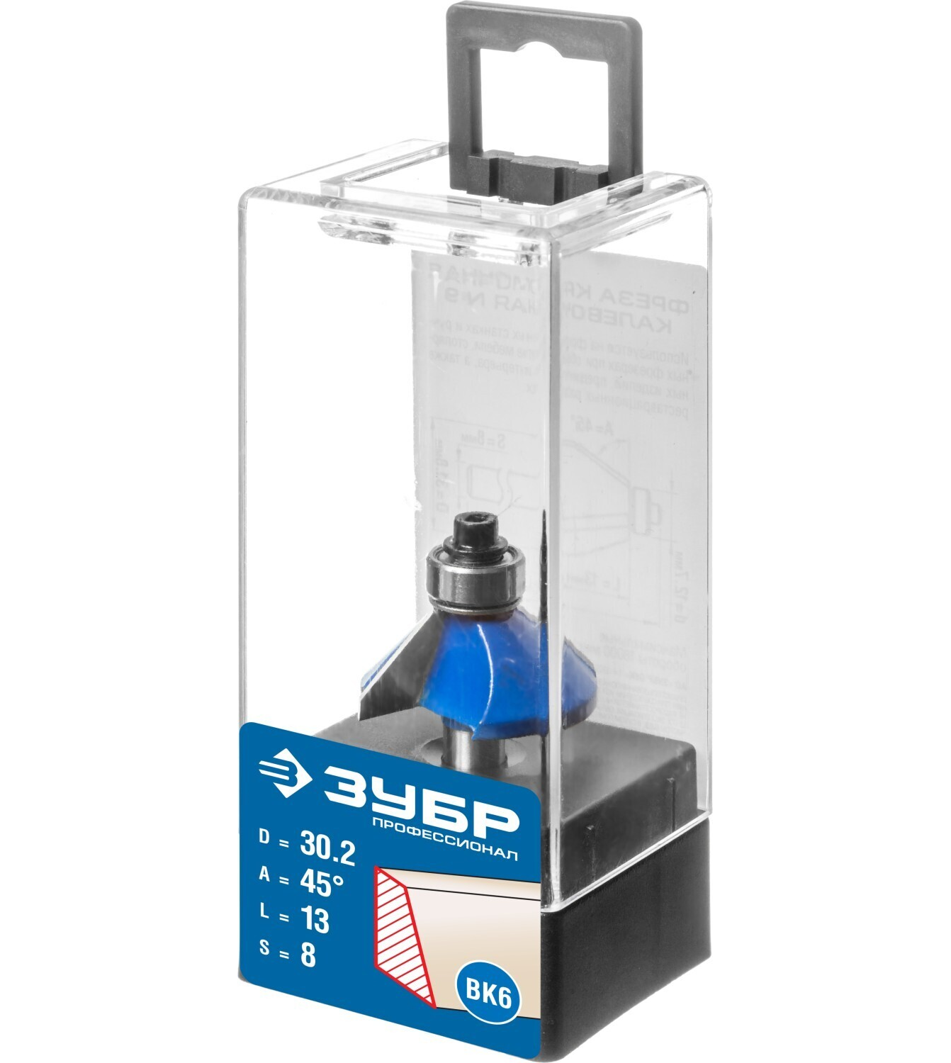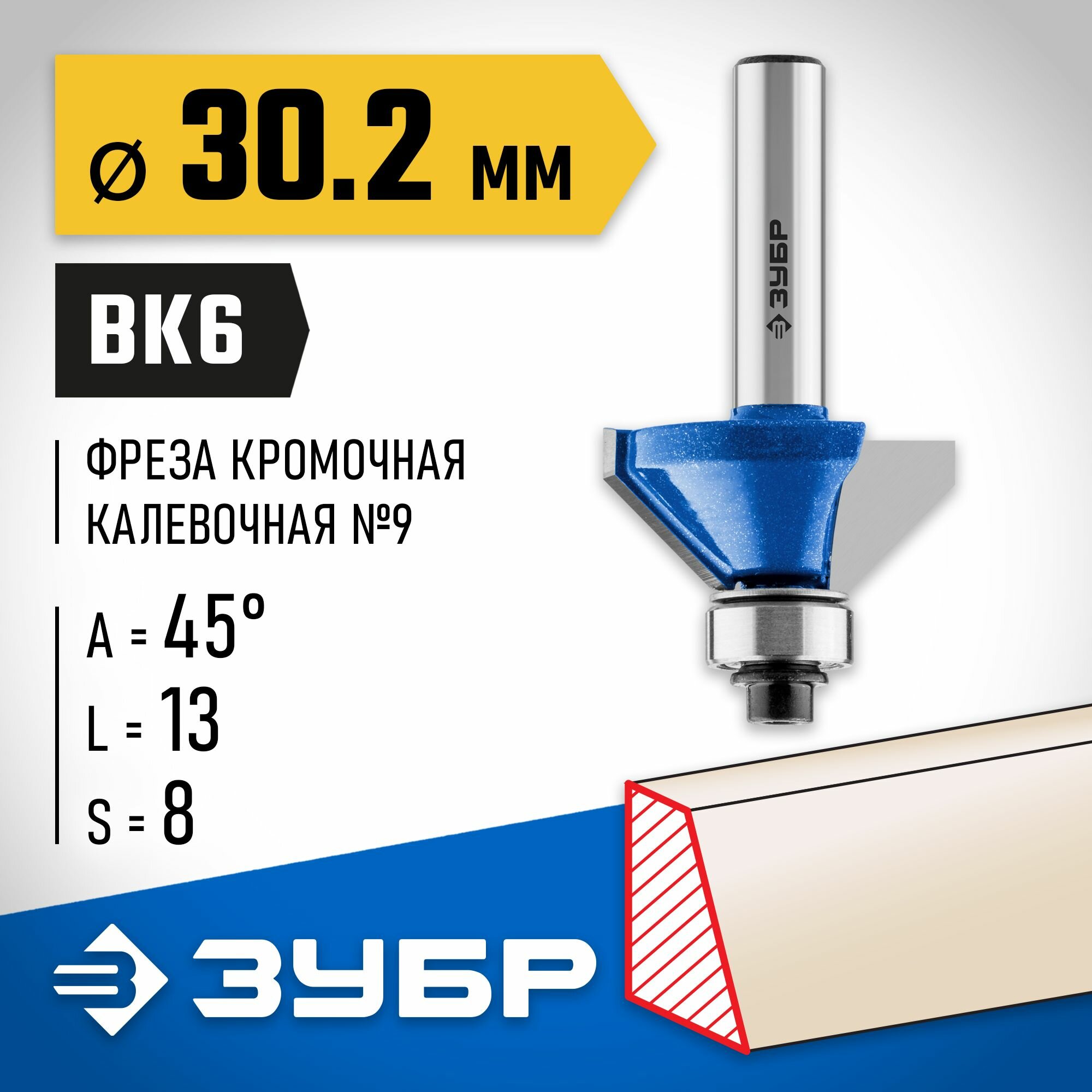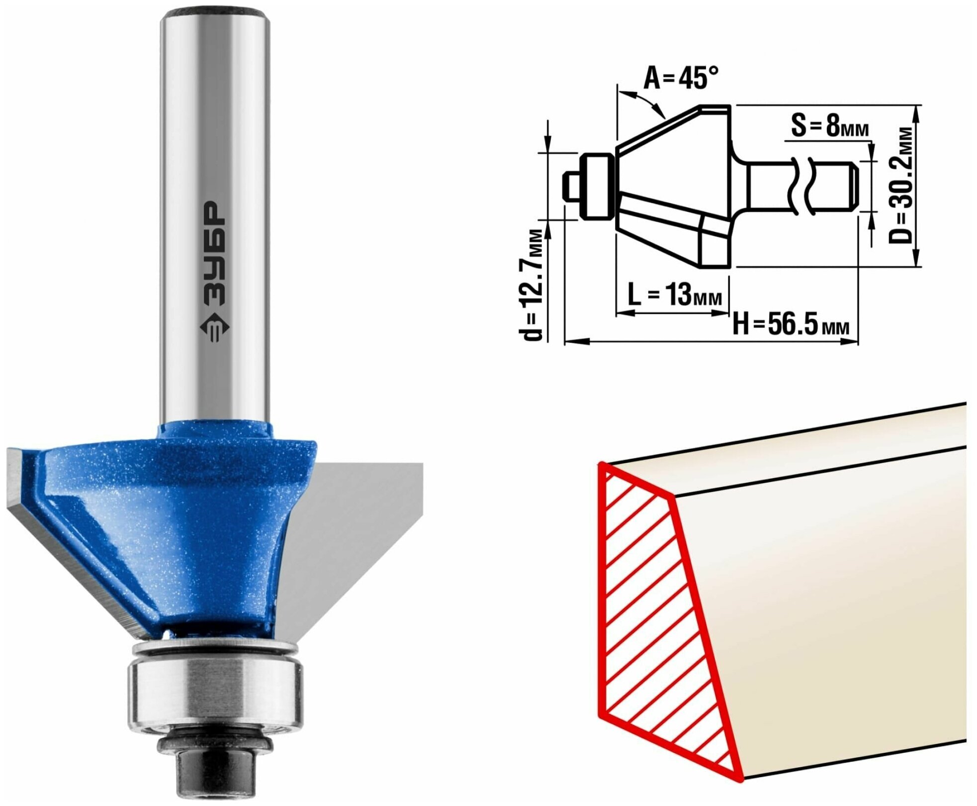Фреза кромочная калевочная(фасочная) №9, D= 30,2мм, рабочая длина-13мм, угол наклона-45 градусов, хв.-8мм, d-12,7мм, ЗУБР Профессионал